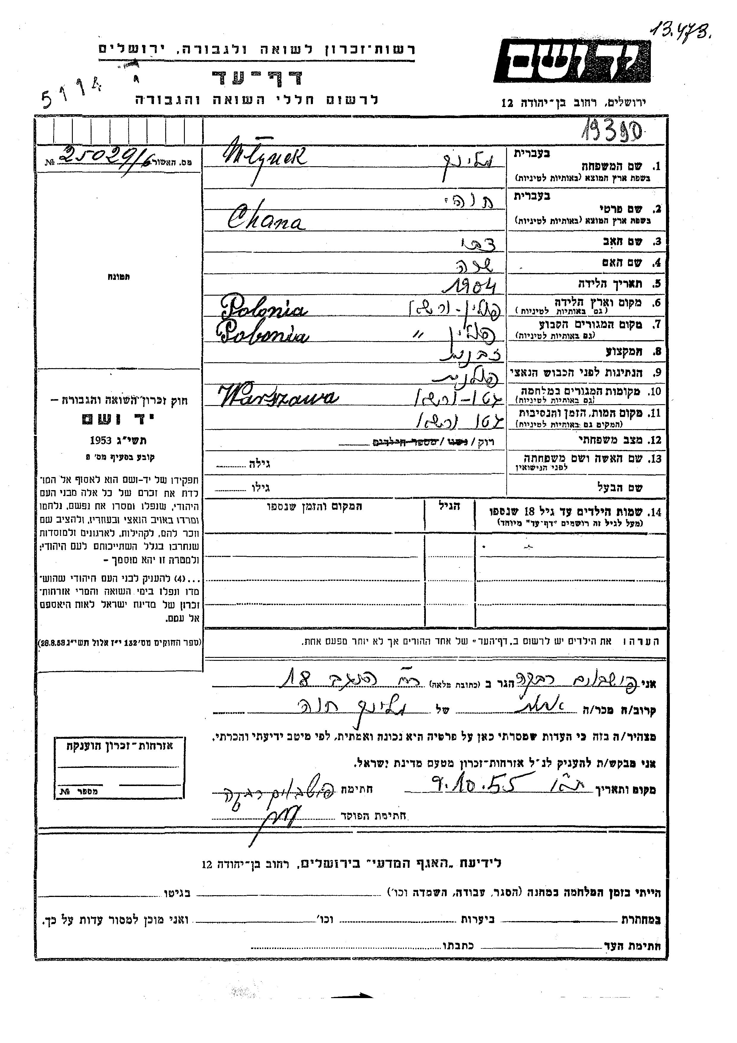 Chana fue asesinada durante la Shoá. Lugar de la muerte: Warsaw, Polonia.