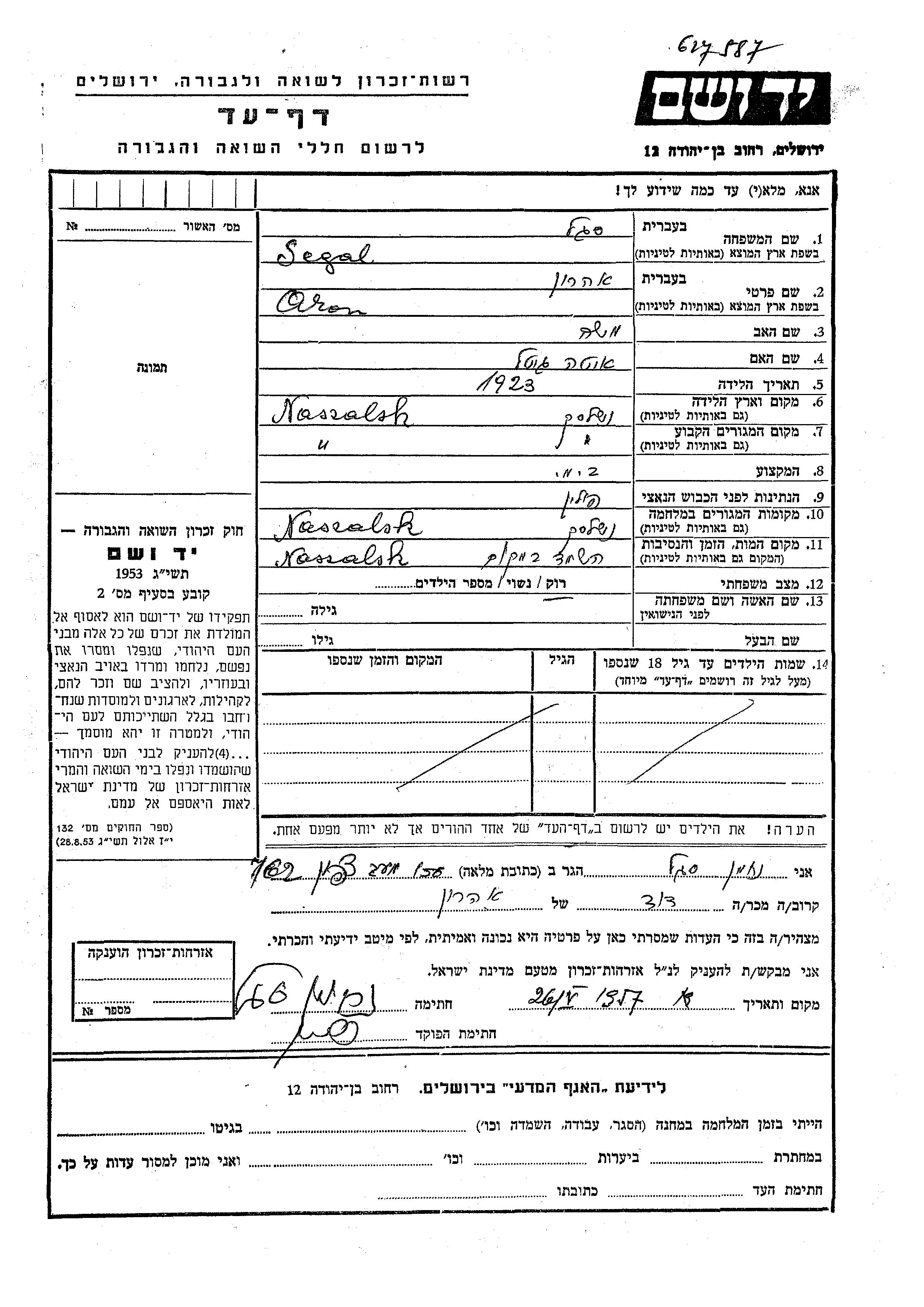 Segal Aron 1923 Naszelsk, Polonia Hoja de Testimonio