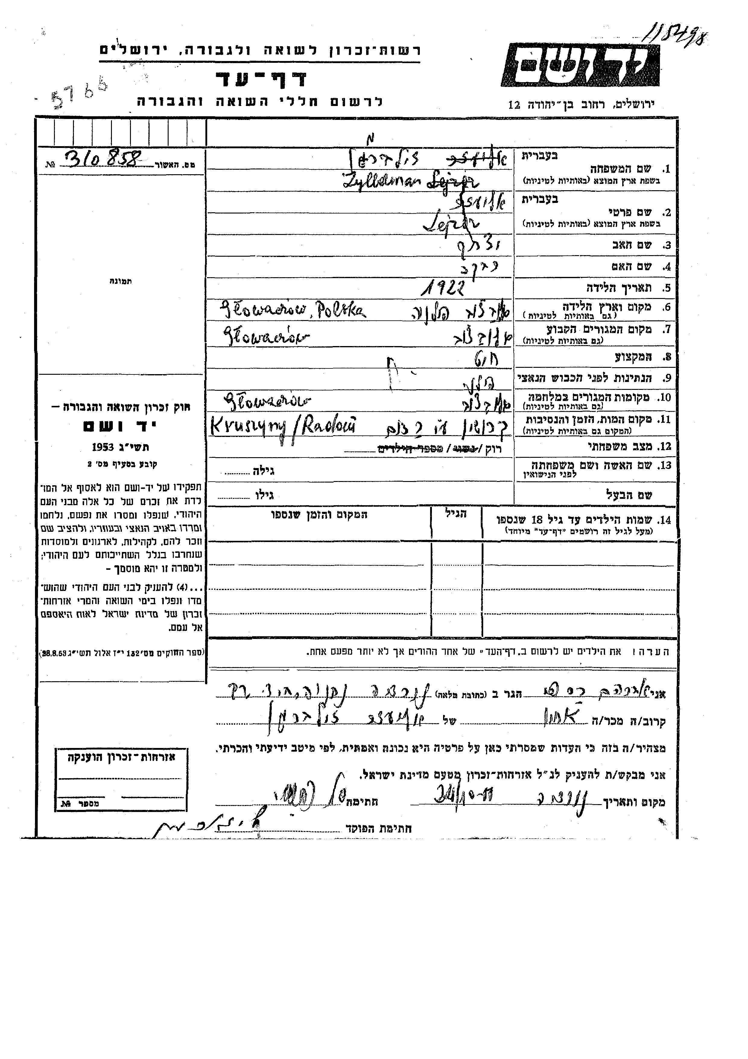 | Zilberman | Eliezer | 1922 | Glowaczow, Polonia | Hoja de Testimonio |