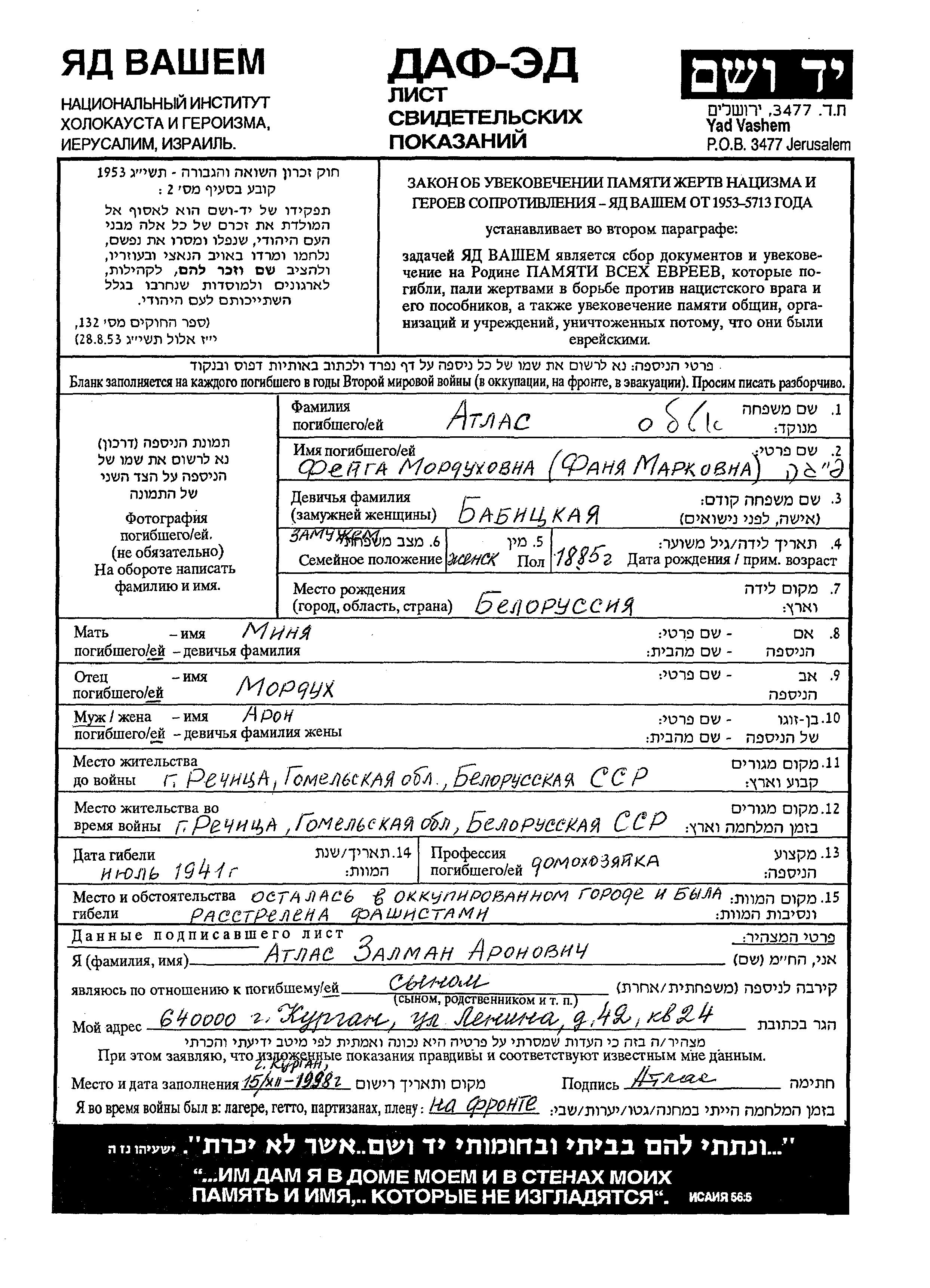 Feiga Fanya Atlas apellido de soltera Babitzki nació en Bielorrusia (URSS) en 1885, hija de Mordukh Mark y Minya. Era Ama de casa y casada con Aron. Antes de la segunda guerra mundial vivía en Rechitsa, Bielorrusia (URSS). Durante la guerra estuvo en Rechitsa, Bielorrusia (URSS).