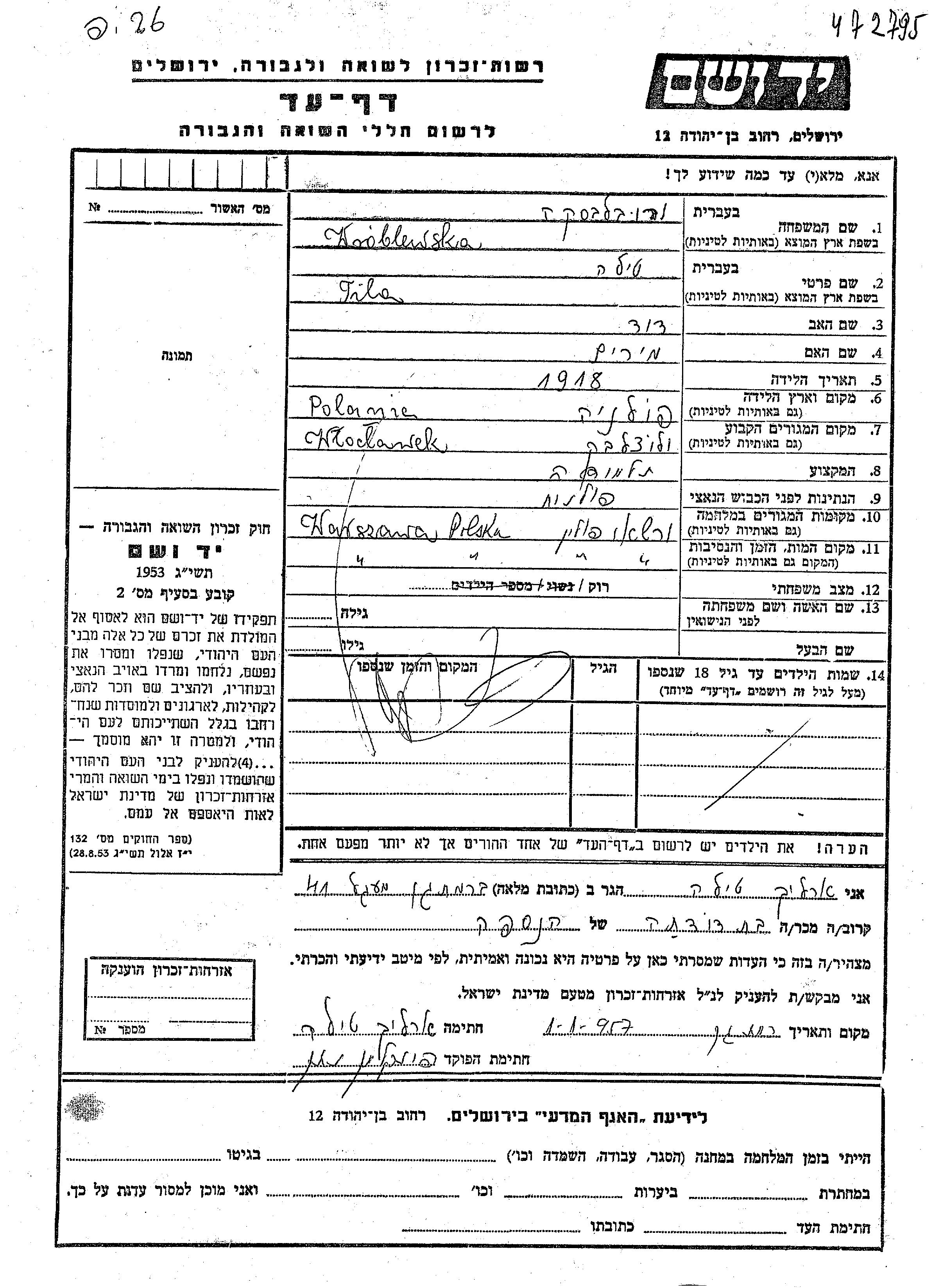 Tila Wroblewska nació en Polonia en 1918, hija de David y Miriam. Era Alumno/a y Solteroa. Antes de la segunda guerra mundial vivía en Wloclawek, Polonia. Durante la guerra estuvo en Warsaw, Polonia.