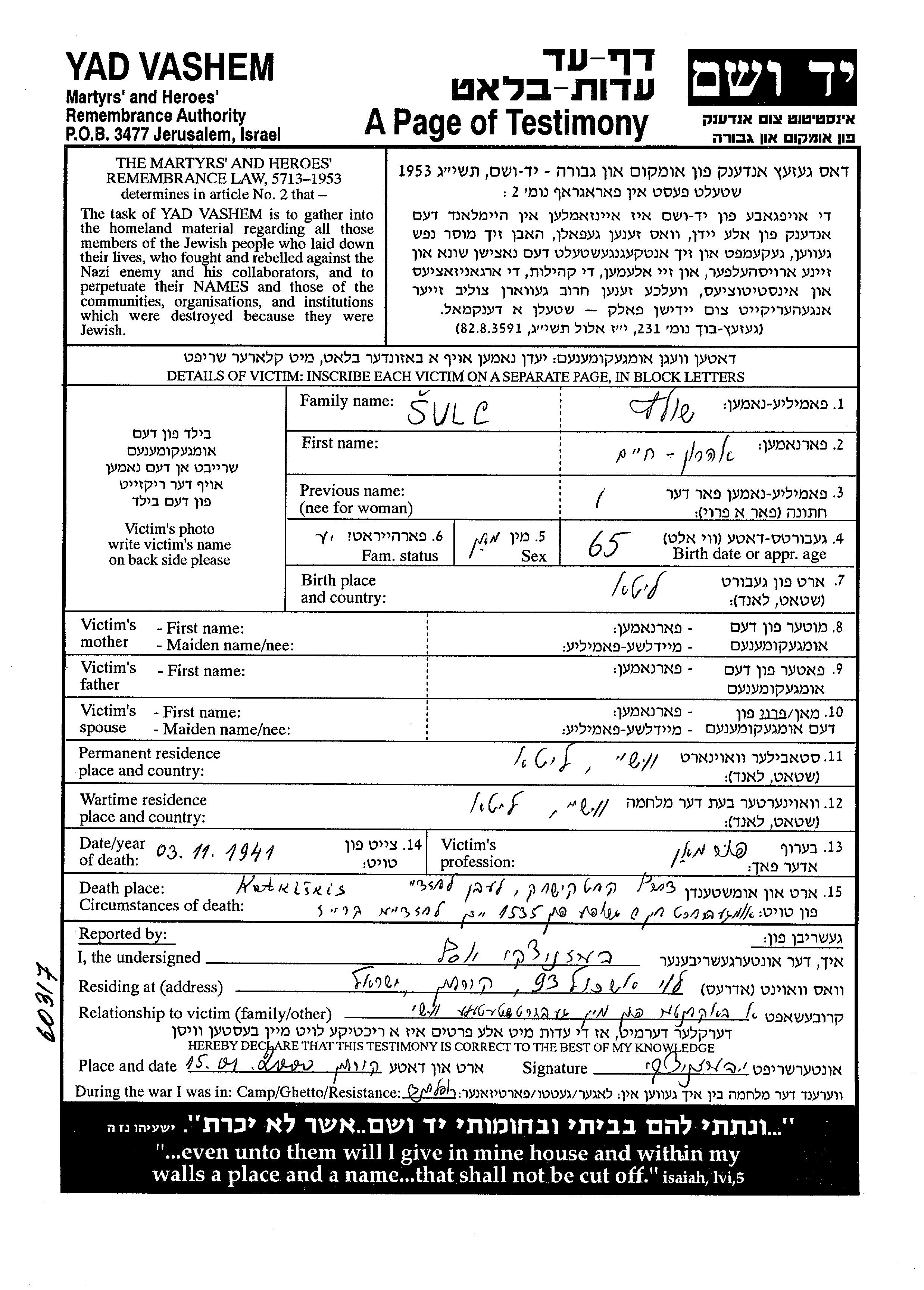 Sulc Aharon Khaim Vishas, Lituania Hoja de Testimonio