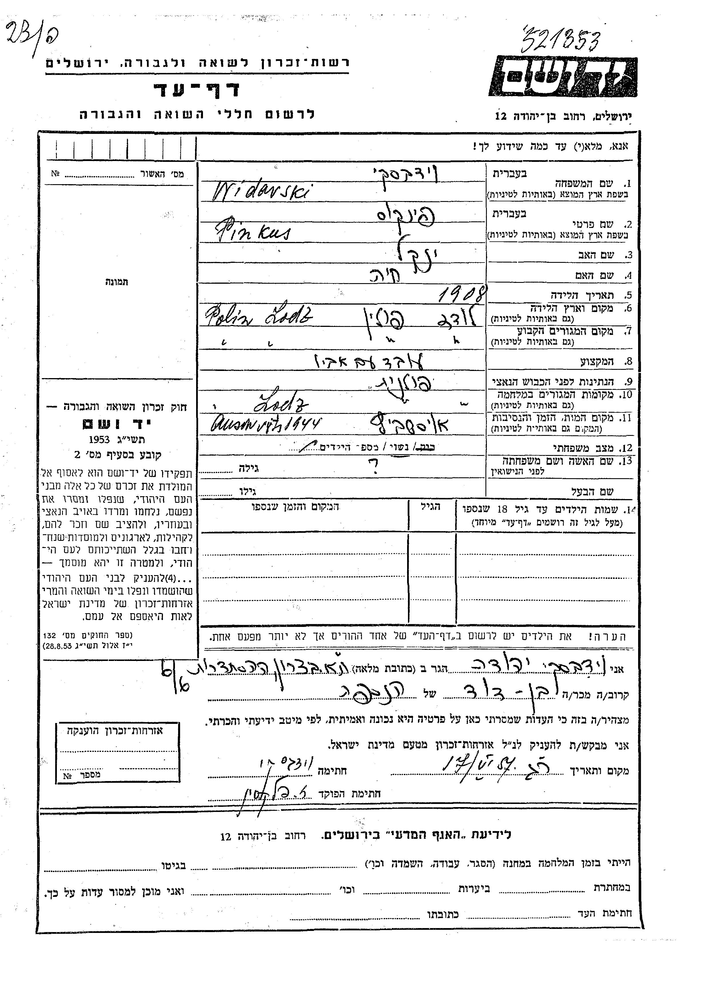 Widavski Pinkhas 1908 Lodz, Polonia Hoja de Testimonio