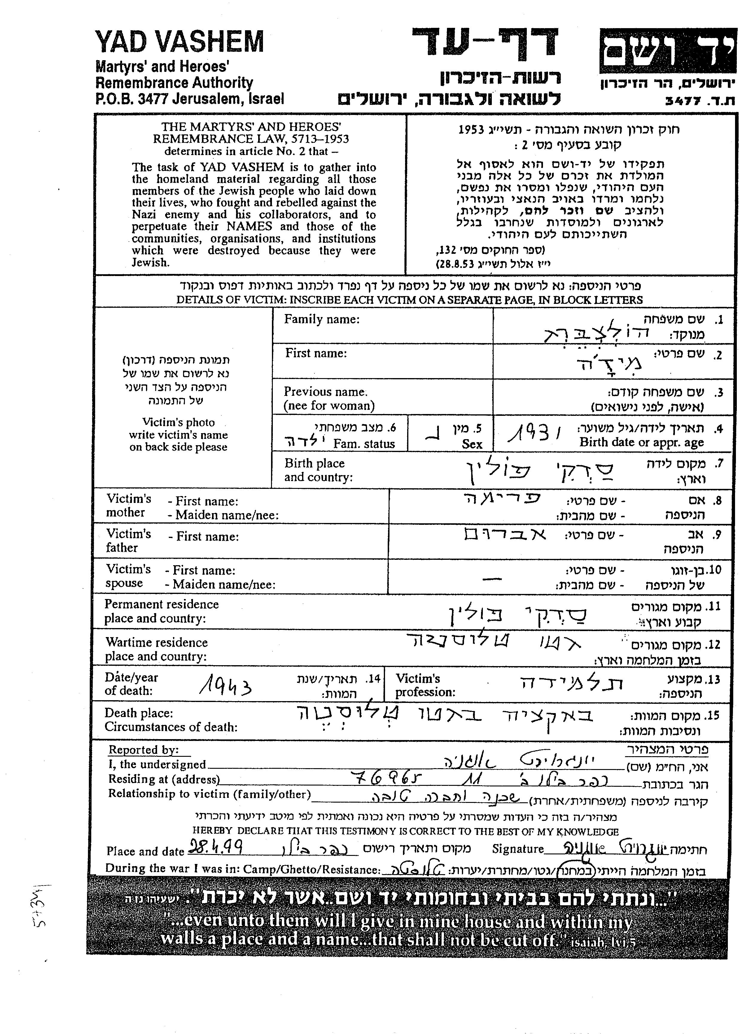 Yad Vashem - Colección conmemorativa de Hojas de Testimonio