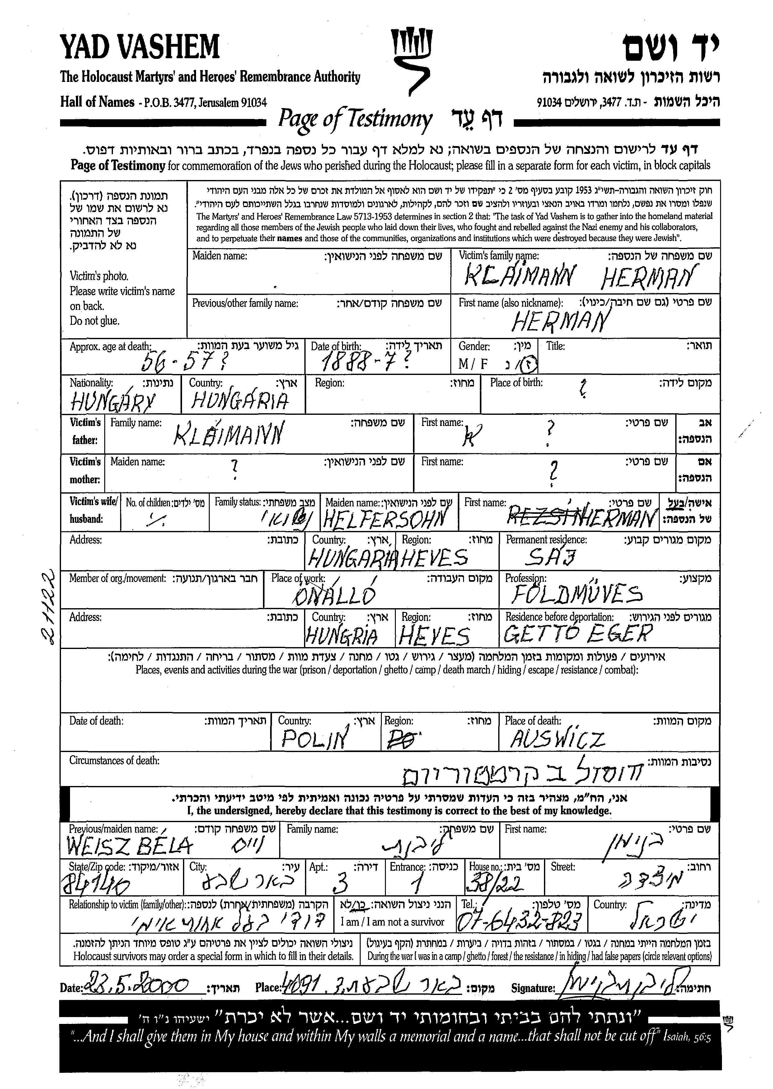 Herman Klaimann nació en Hungría en 1888. Era Campesino/a y Casado. Antes de la segunda guerra mundial vivía en Saj, Hungría. Durante la guerra estuvo en Eger, Hungría.