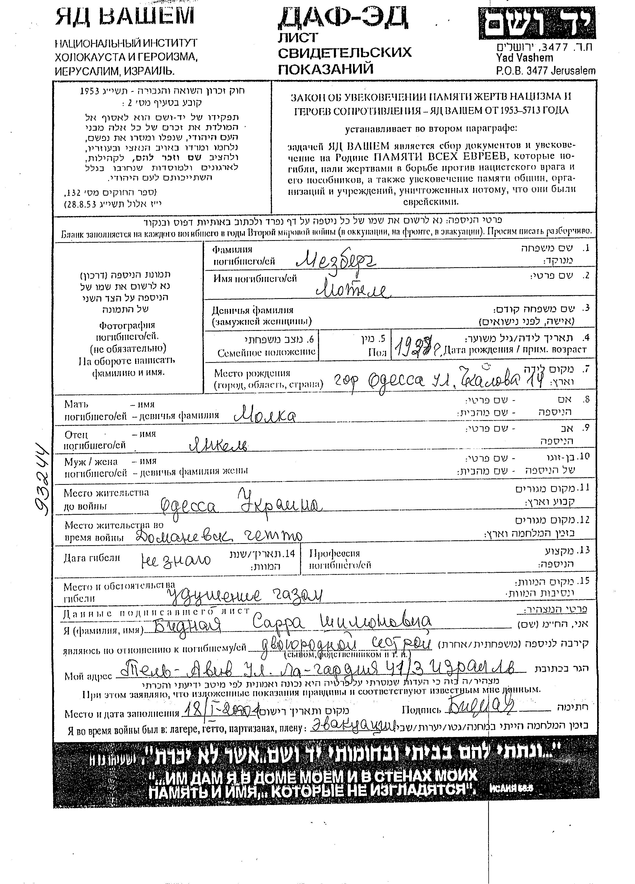 Mezberg Motele 1928 Odessa, Ucrania (URSS) Hoja de Testimonio
