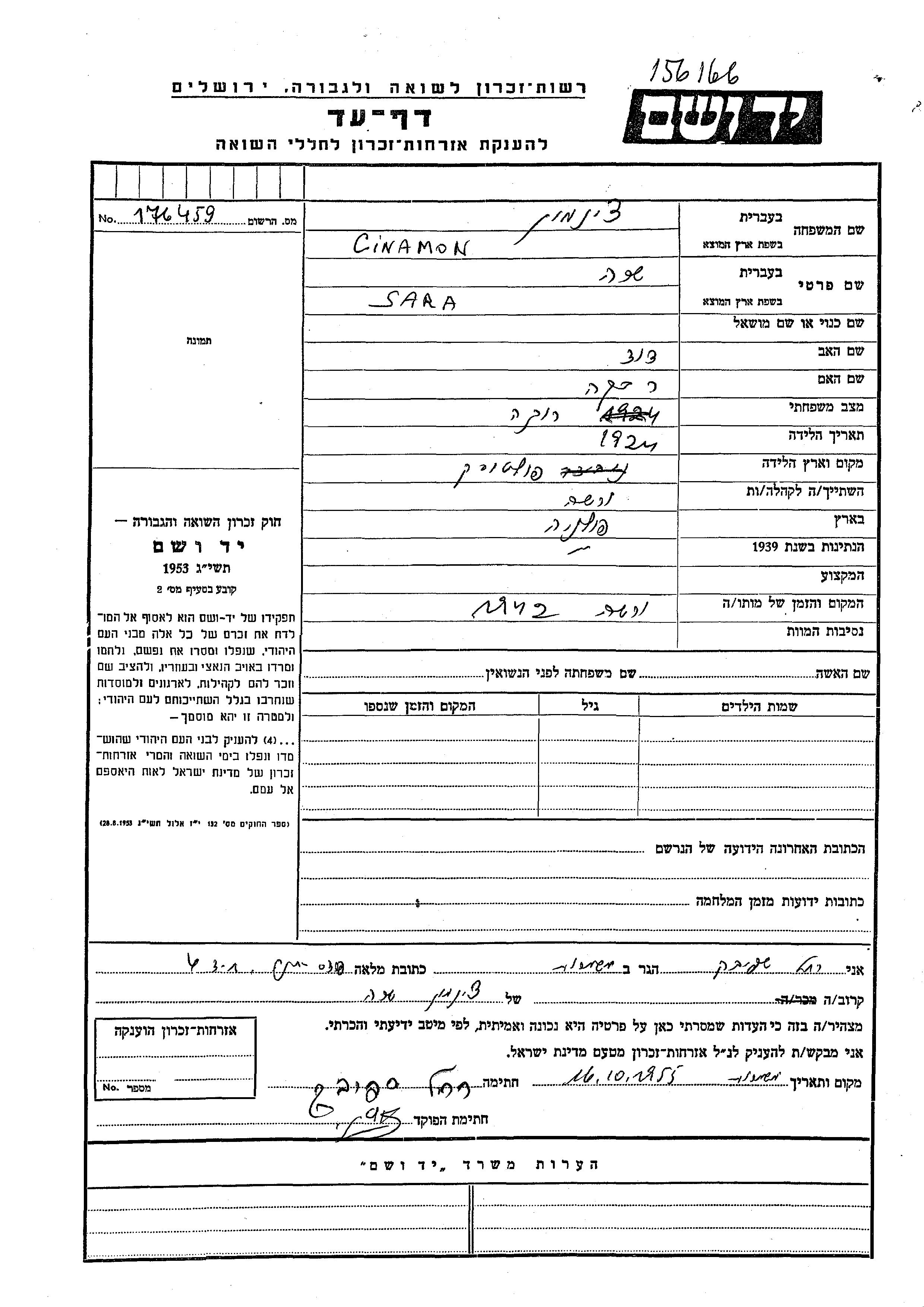 Sara Cinamon nació en Poltosk, Polonia en 1924, hija de David y Rivka. Era Solteroa.