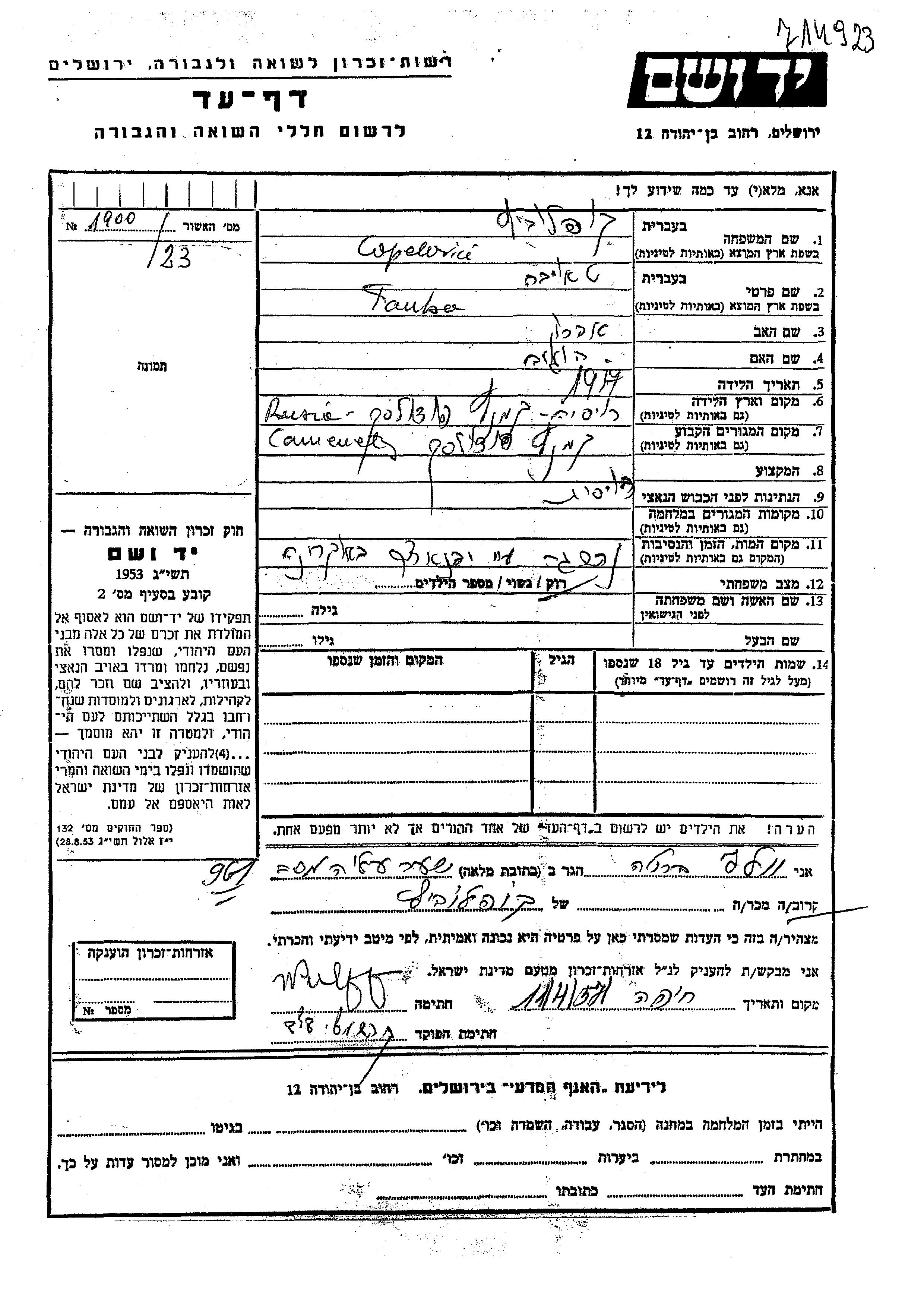 Copelovici Tauba 1917 Kamenets Podolskiy, Ucrania (URSS) Hoja de Testimonio