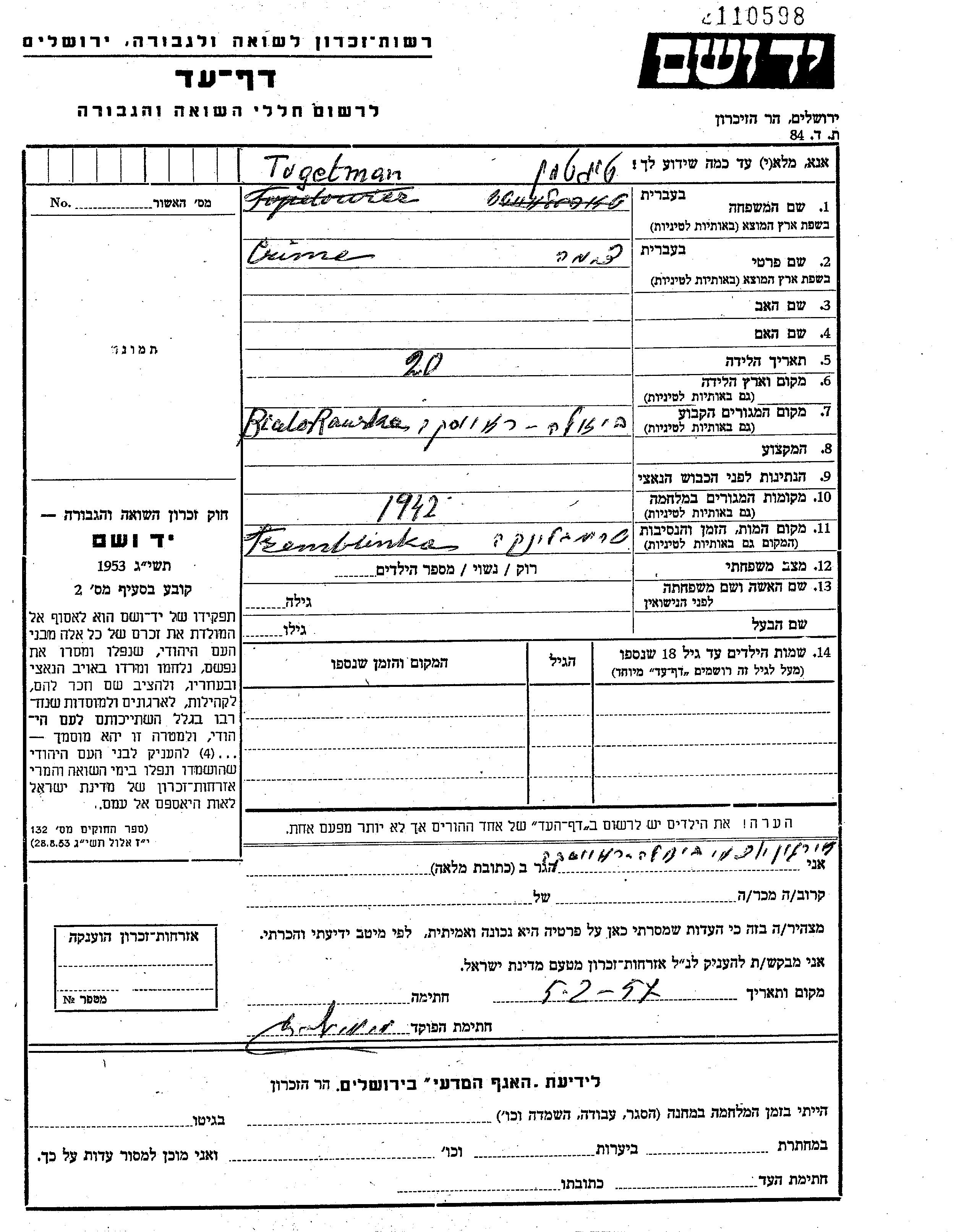 Tugetman Czime Biala Rawska, Polonia Hoja de Testimonio