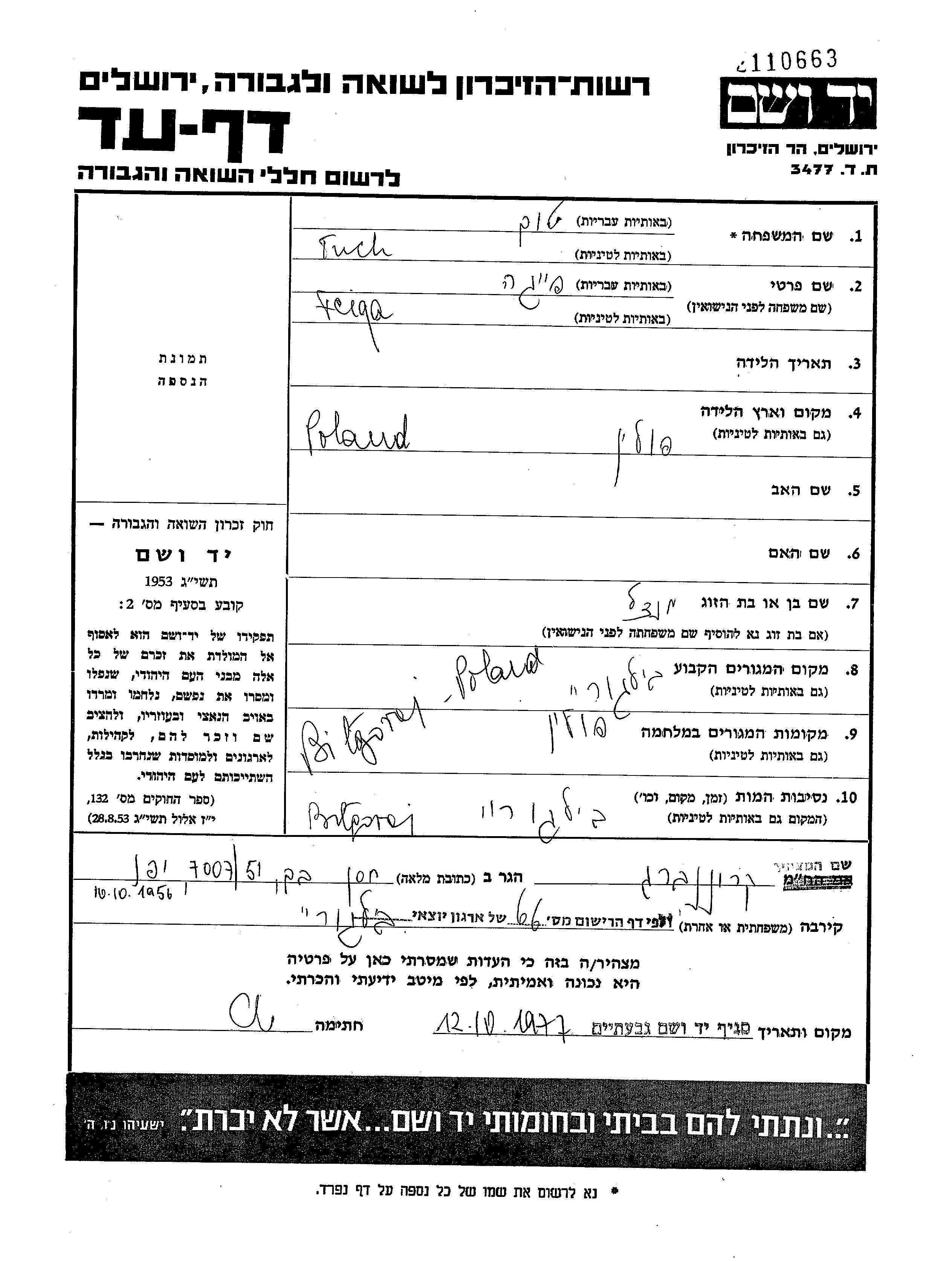 Tuch Feiga lugar desconocido, Hoja de Testimonio