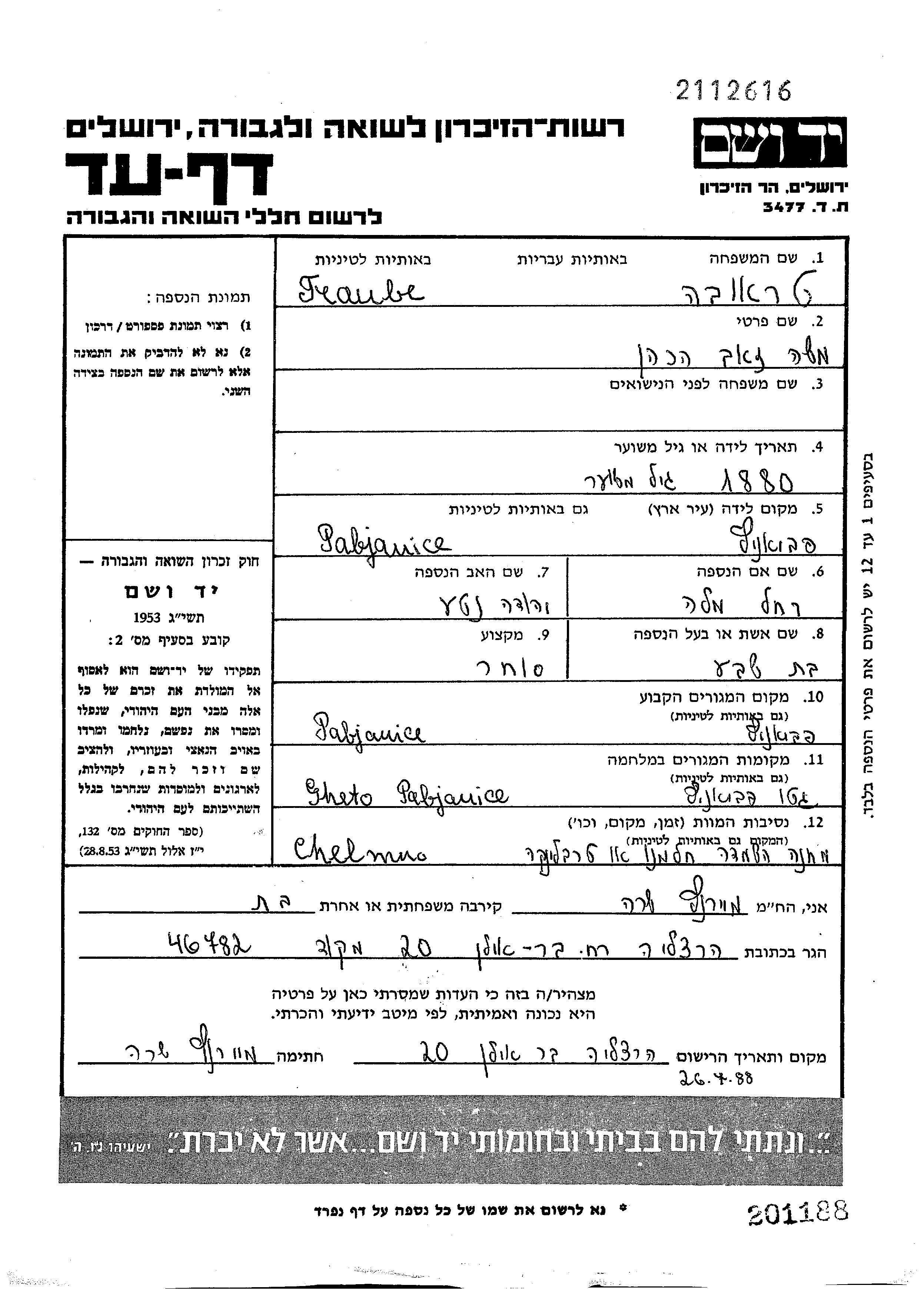 Traube Hacohen Moshe Zeev 1880 Pabianice, Polonia Hoja de Testimonio