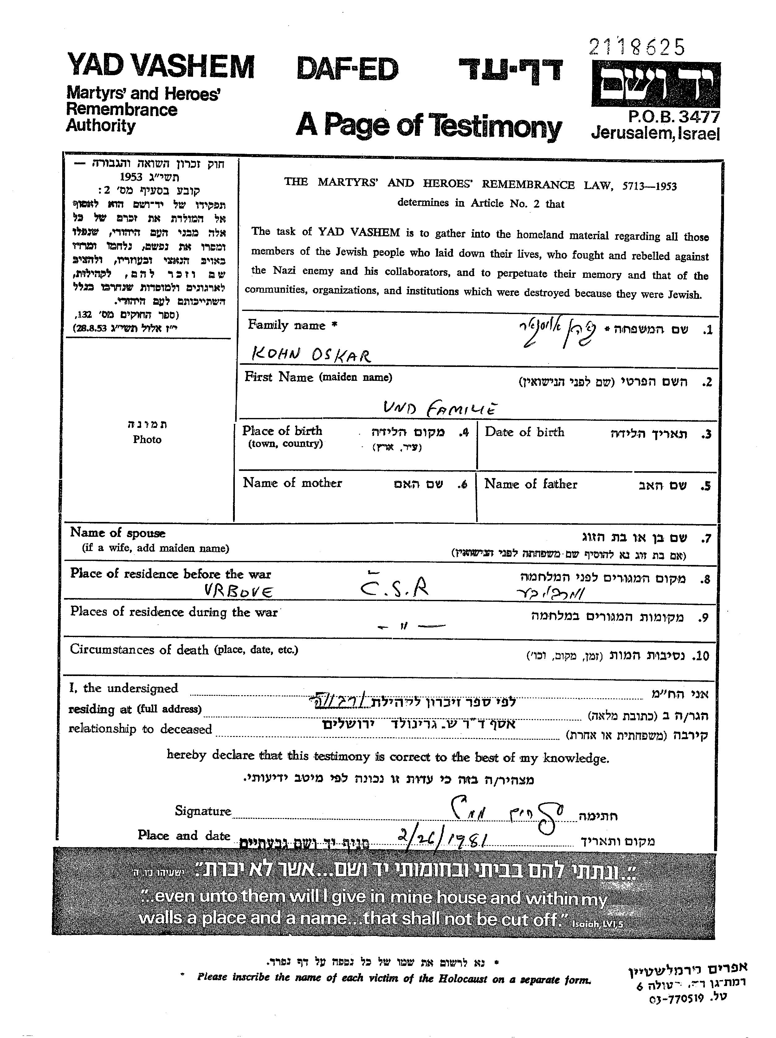 Kohn Kun Oskar Vrbove, Checoslovaquia Hoja de Testimonio