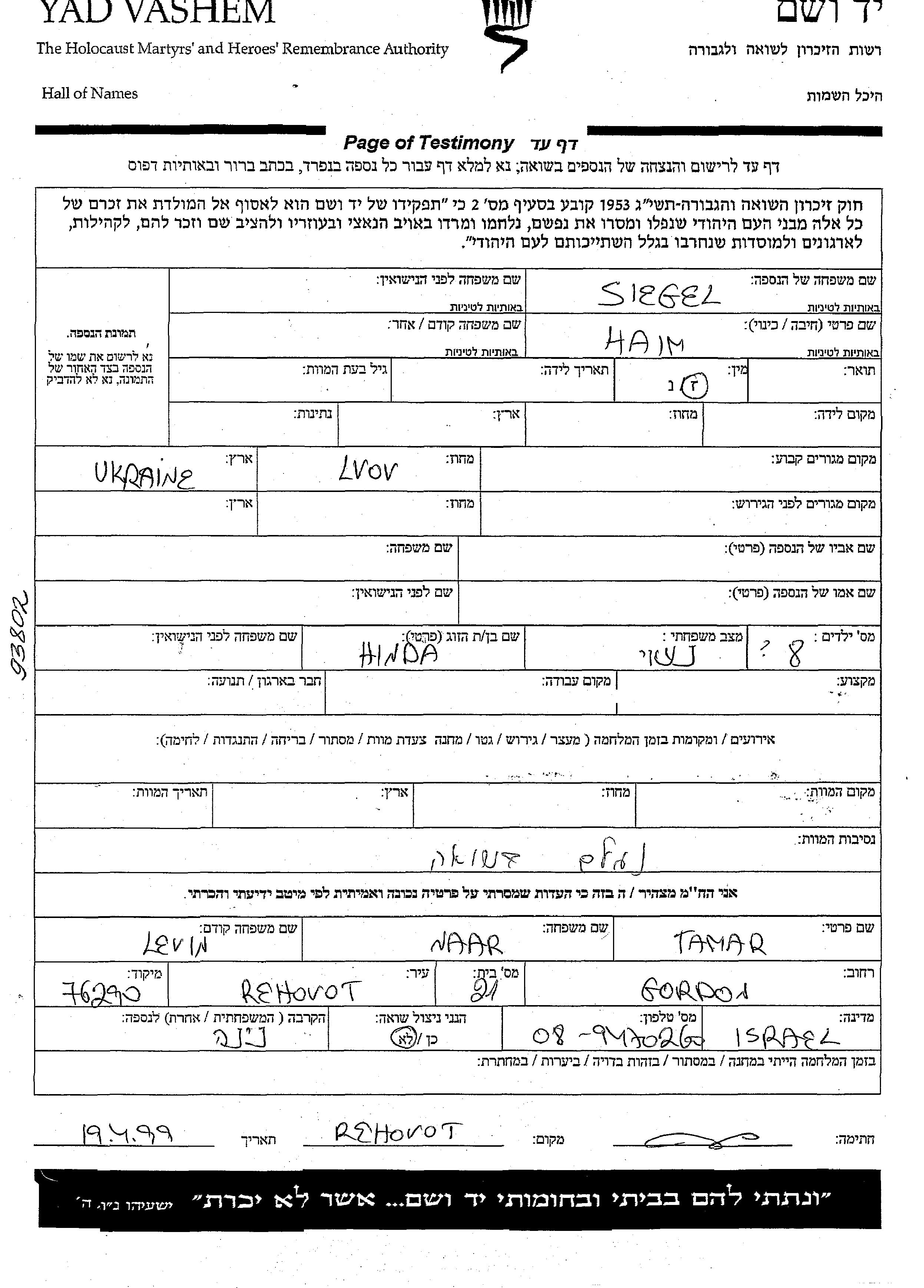 Siegel Haim Lwow, Polonia Hoja de Testimonio