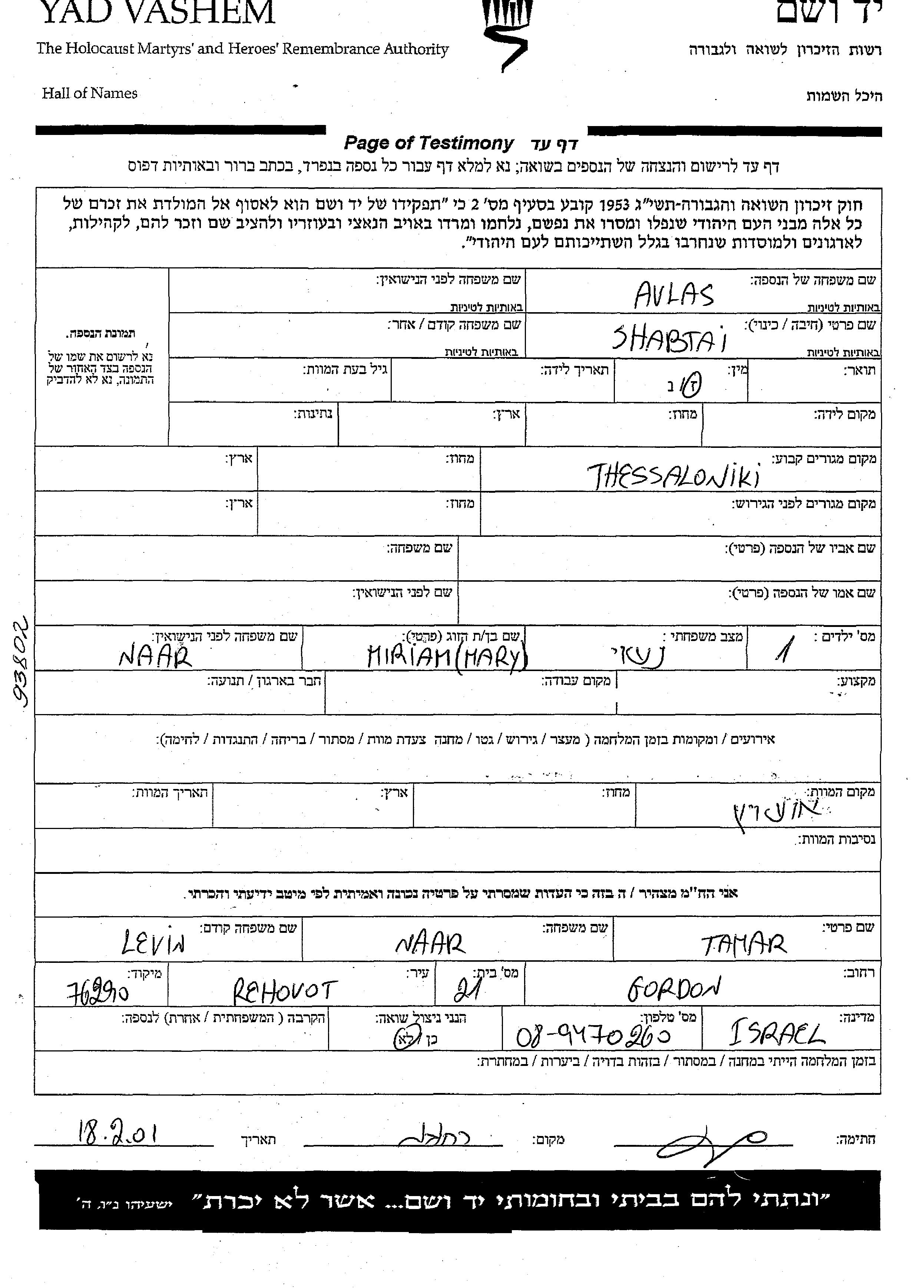 Avlas Shabtai Thessaloniki, Grecia Hoja de Testimonio