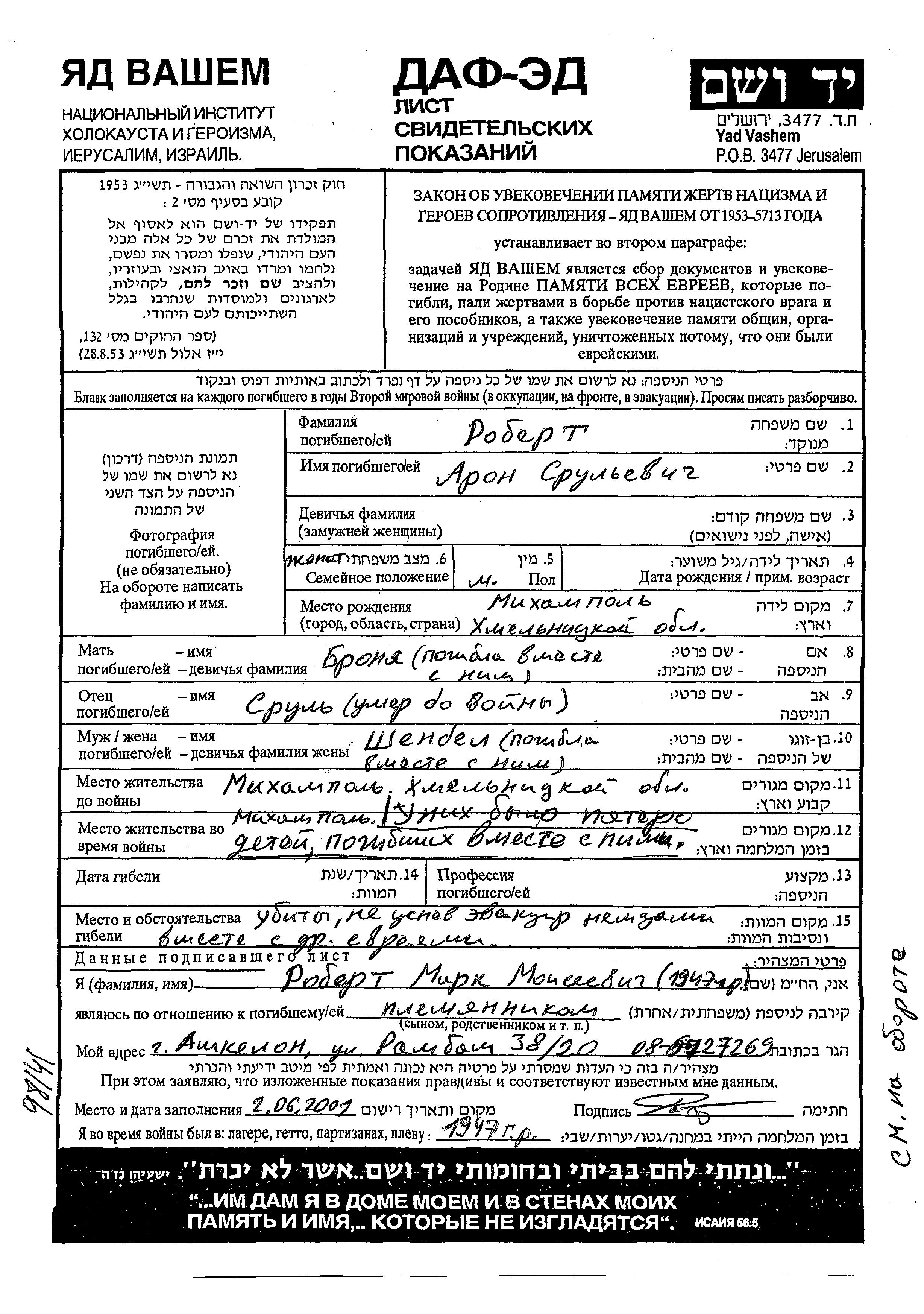 Robert Aron Mikhampol, Ucrania (URSS) Hoja de Testimonio