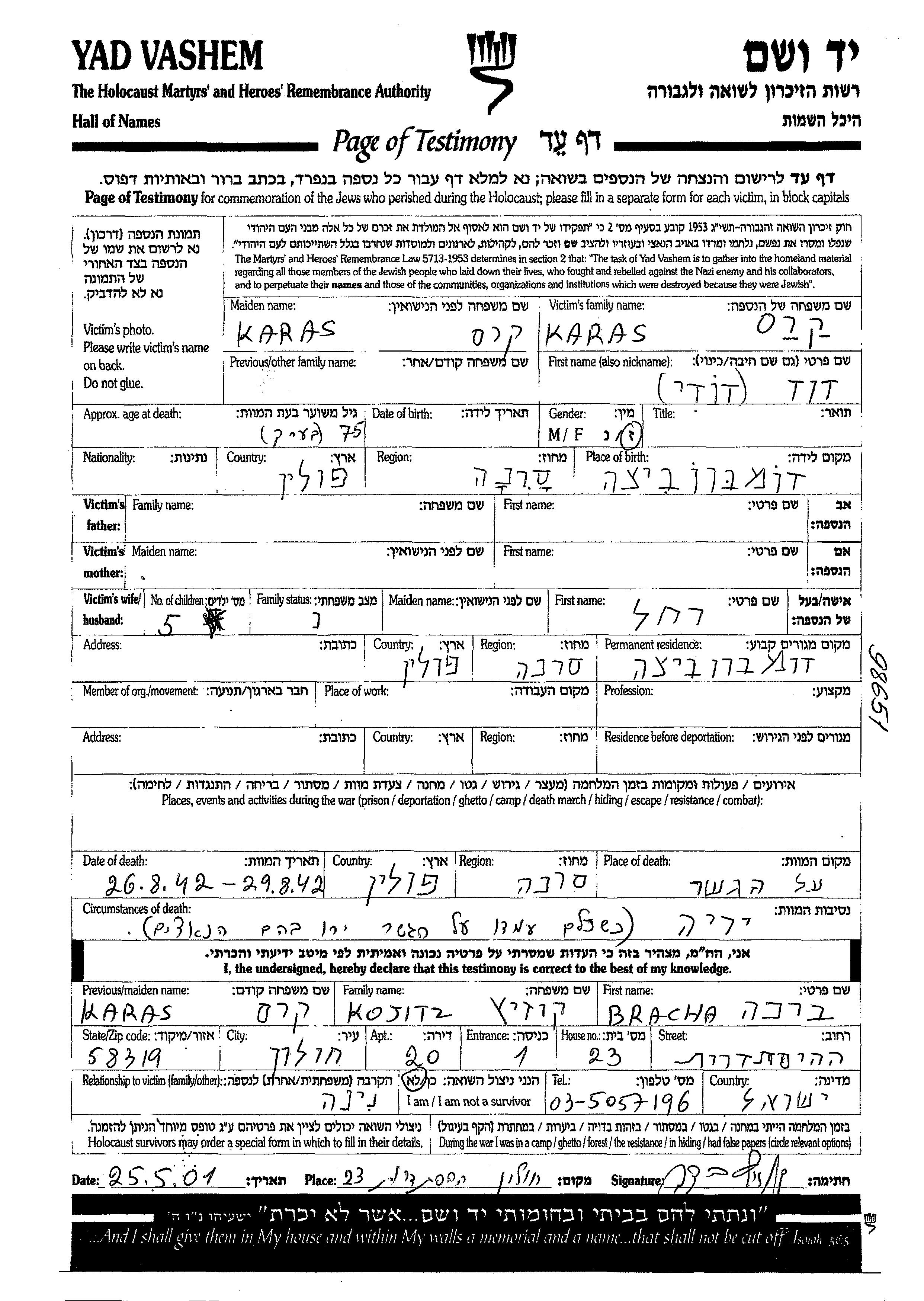 Karas David Dombrowica, Polonia Hoja de Testimonio