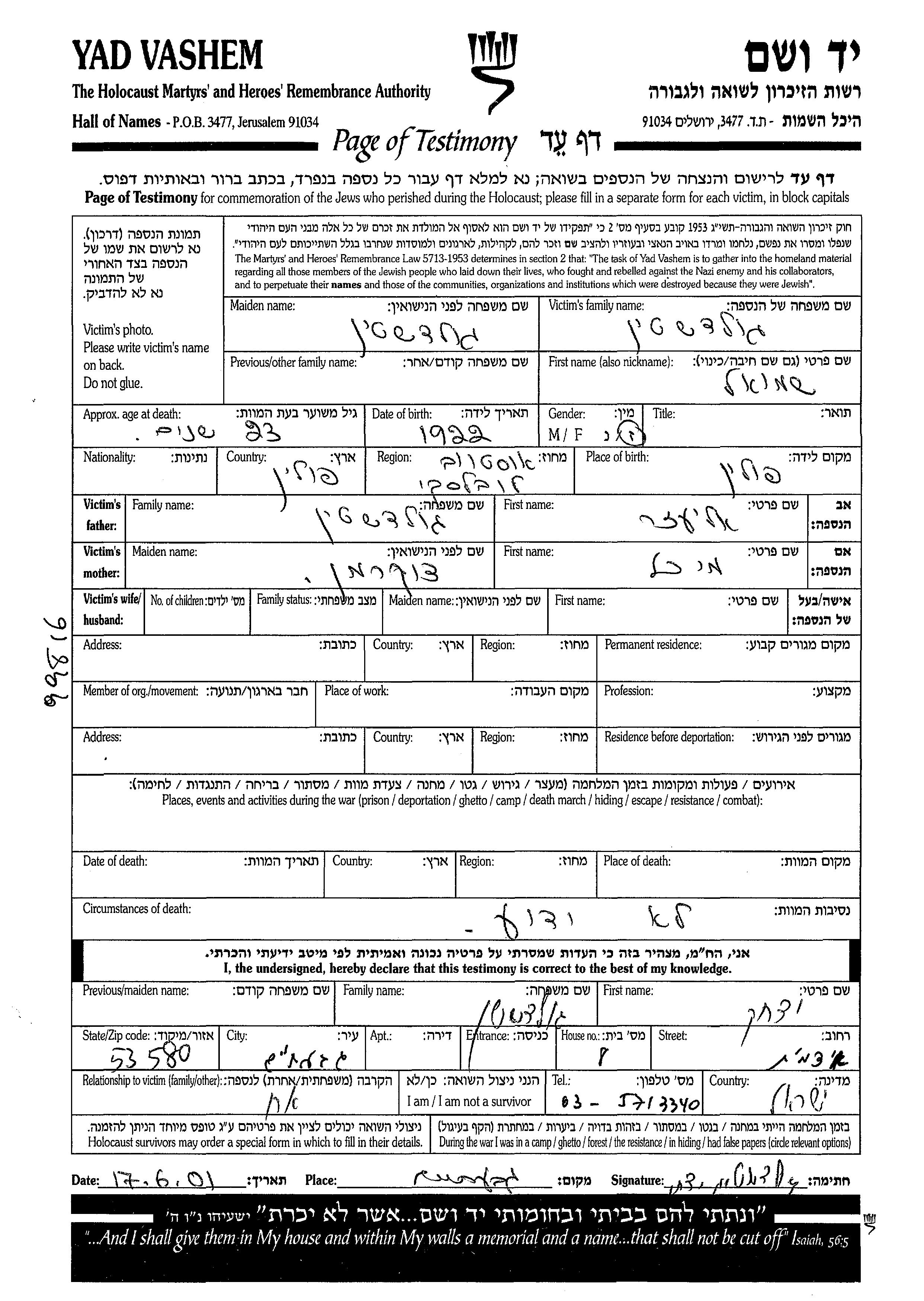 Goldshtein Shmuel 1922 lugar desconocido, Hoja de Testimonio