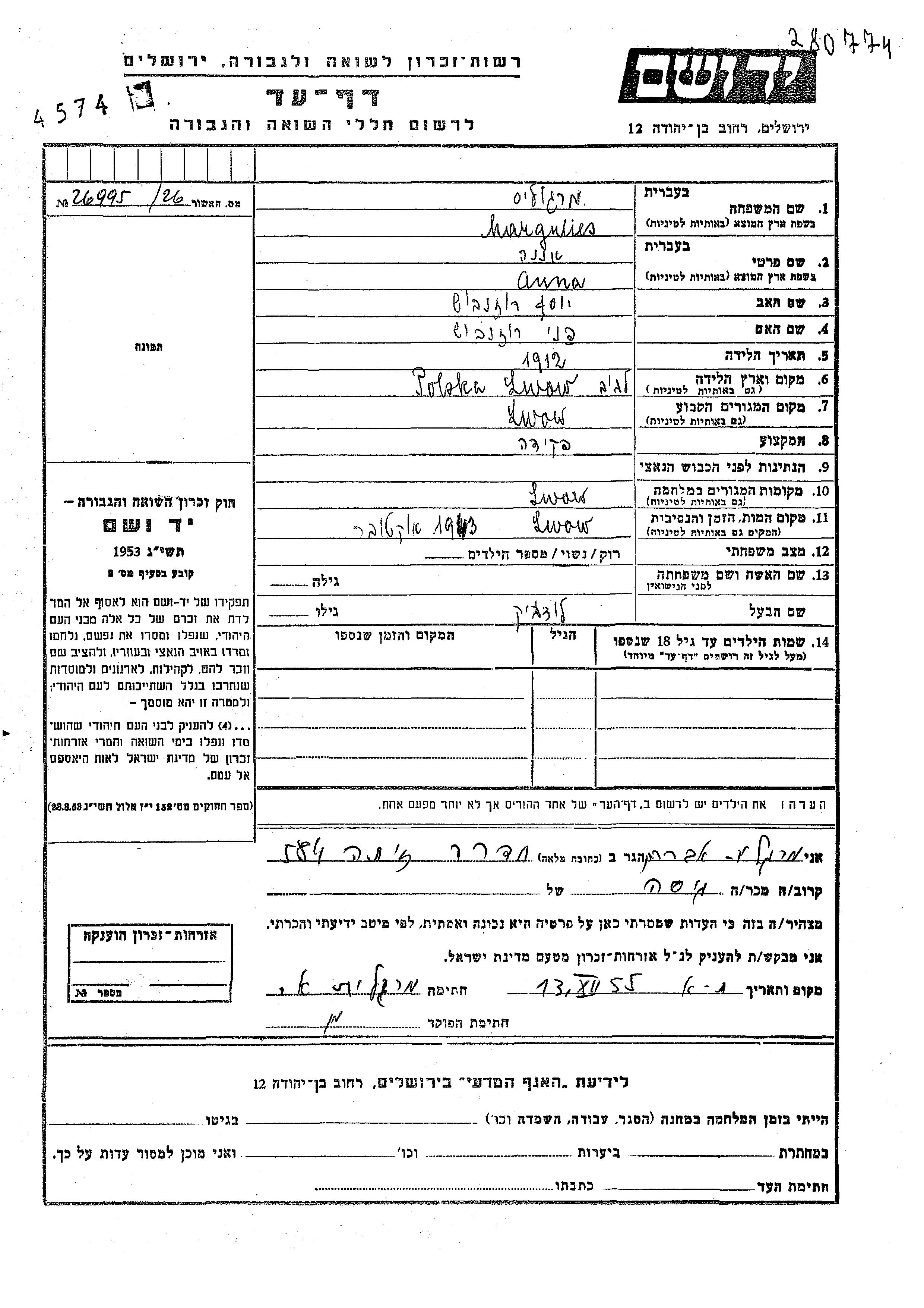 Margulis Anna 1912 Lwow, Polonia Hoja de Testimonio