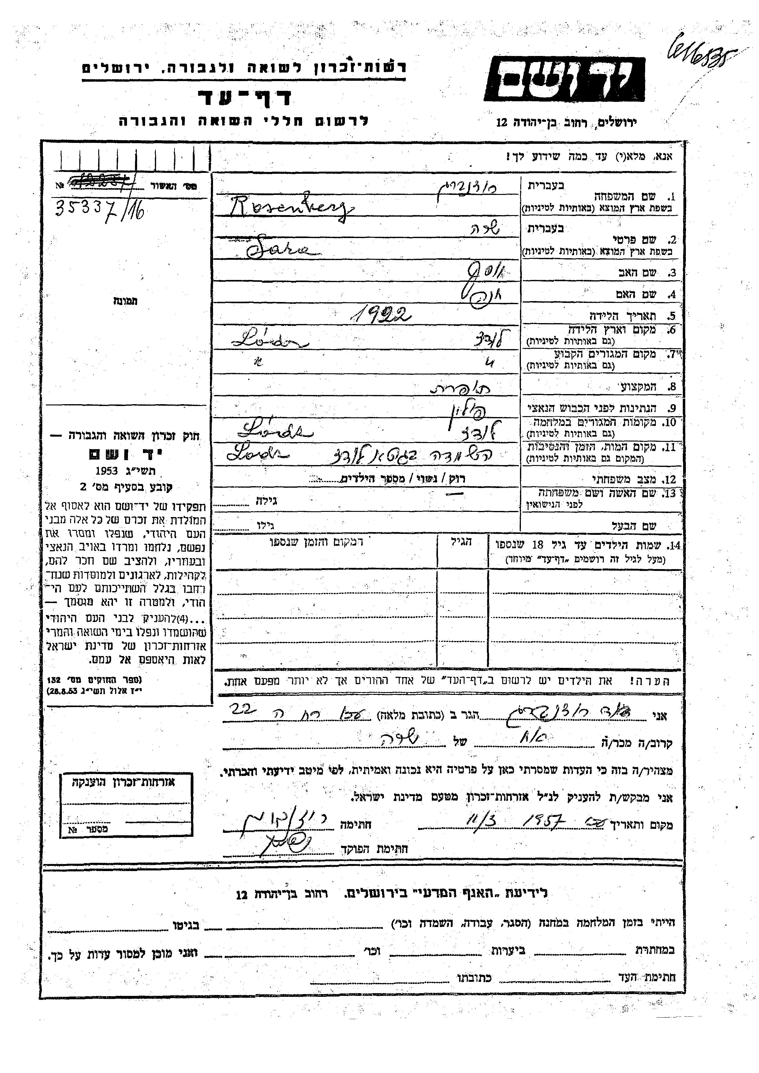 Rosenberg Sara 1922 Lodz, Polonia Hoja de Testimonio