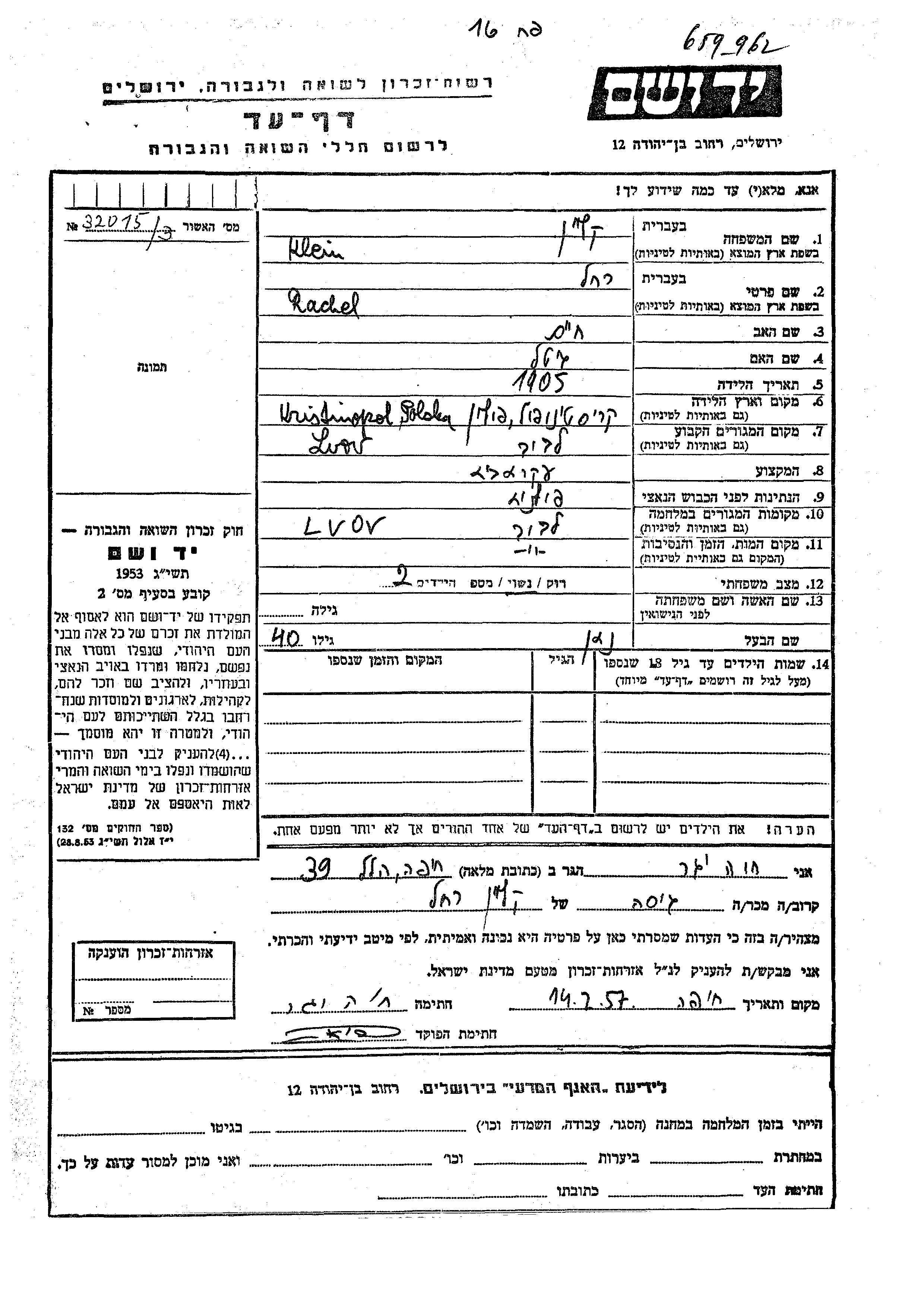 Klein Rachel 1905 Lwow, Polonia Hoja de Testimonio