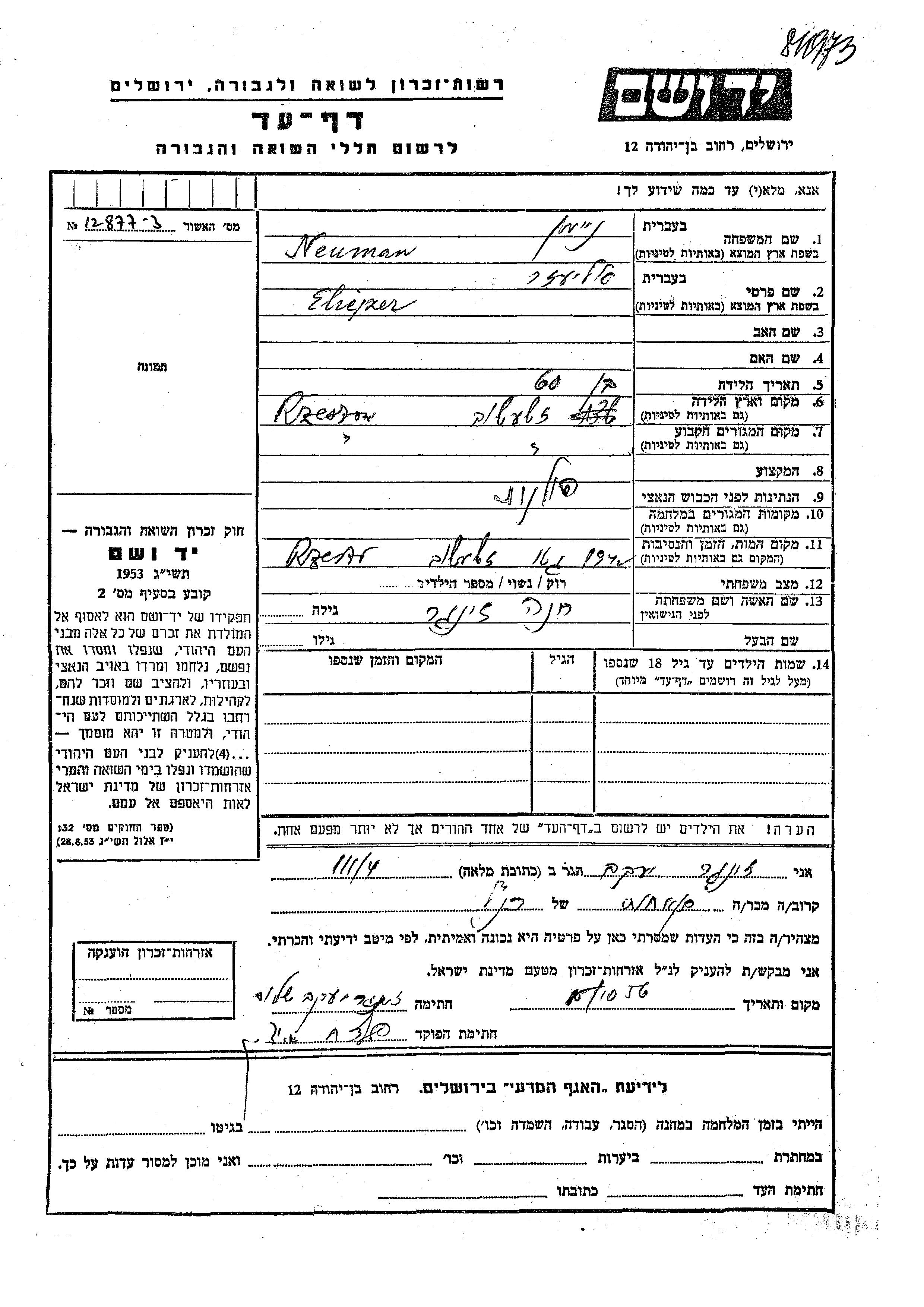 Neuman Eliejzer Rzeszow, Polonia Hoja de Testimonio