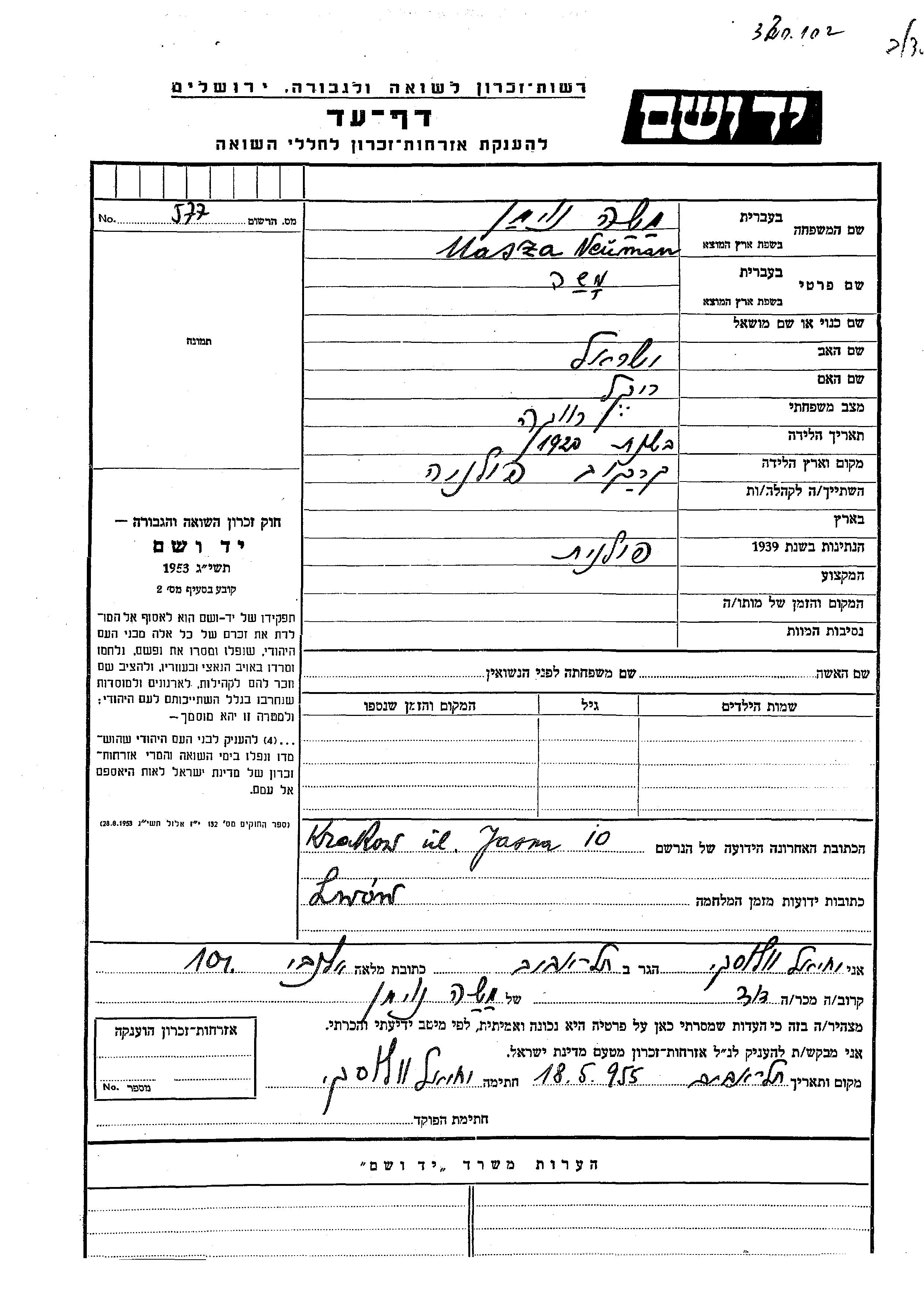 Neuman Masza Moshe 1920 lugar desconocido, Hoja de Testimonio