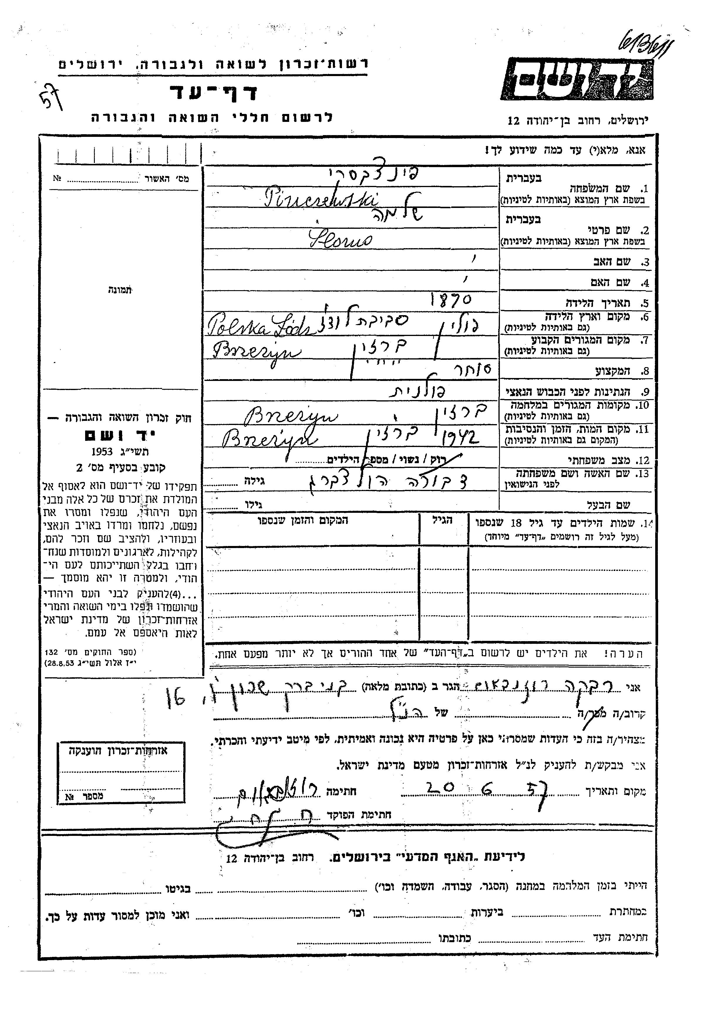 Pinczewski Slomo 1890 Brzezin, Polonia Hoja de Testimonio