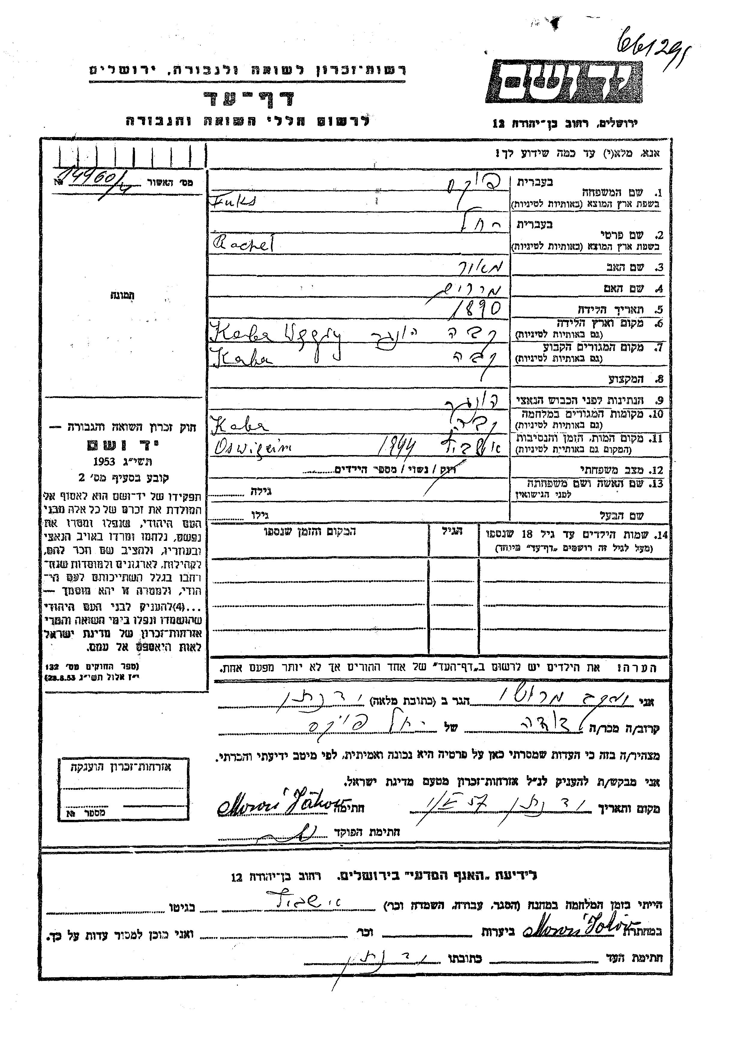 Rachel fue asesinada durante la Shoá. Lugar de la muerte: Auschwitz, Polonia en 1944.