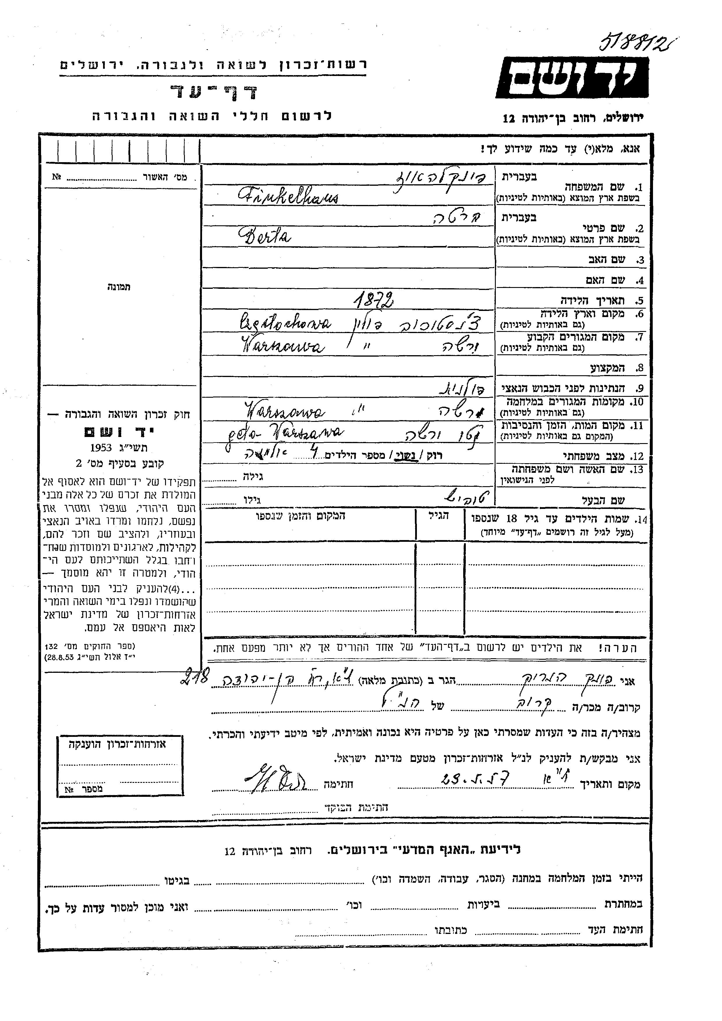 Finkelhaus Berta 1872 Warszawa, Polonia Hoja de Testimonio