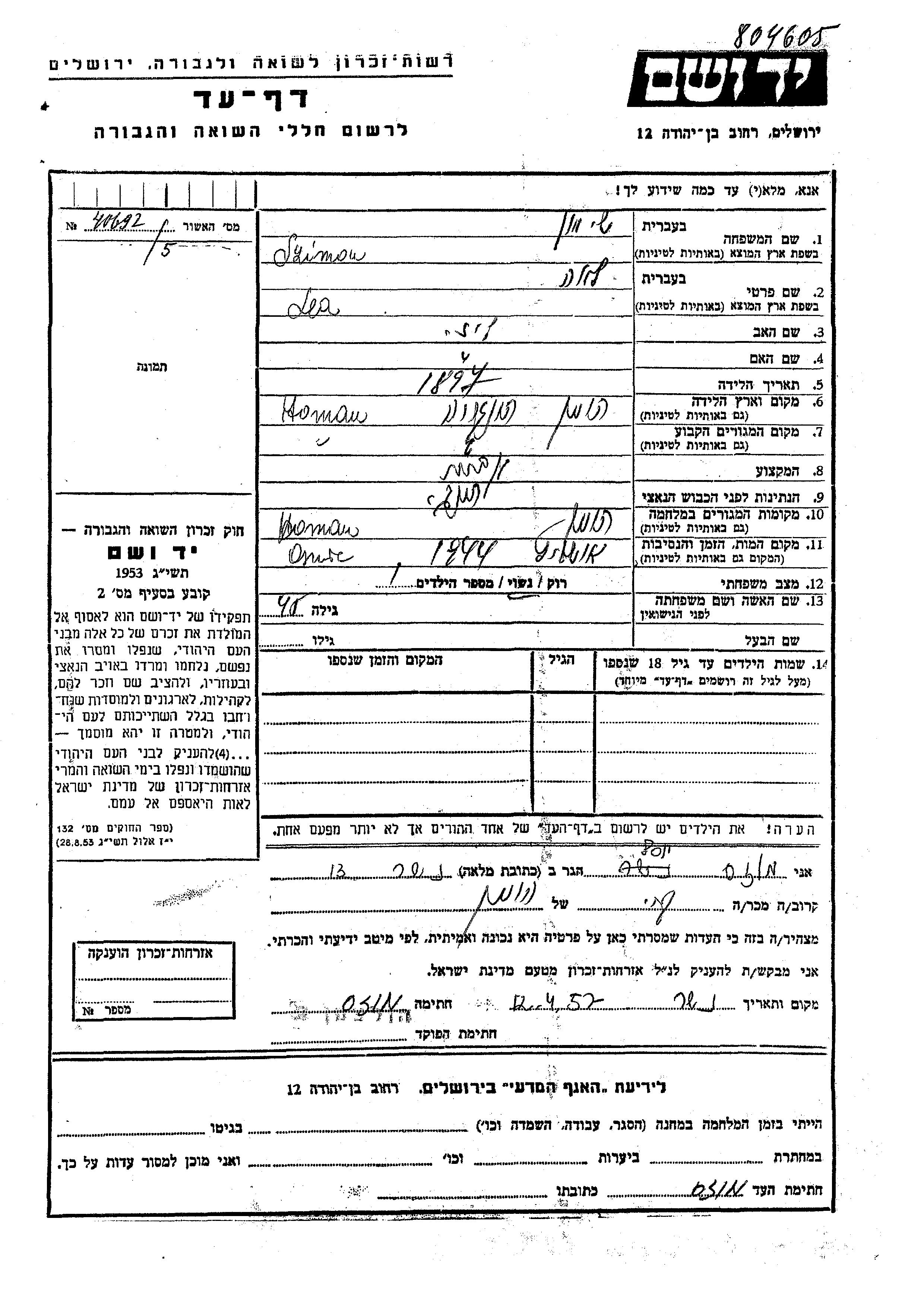 Szimon Lea 1897 Homan, Checoslovaquia Hoja de Testimonio
