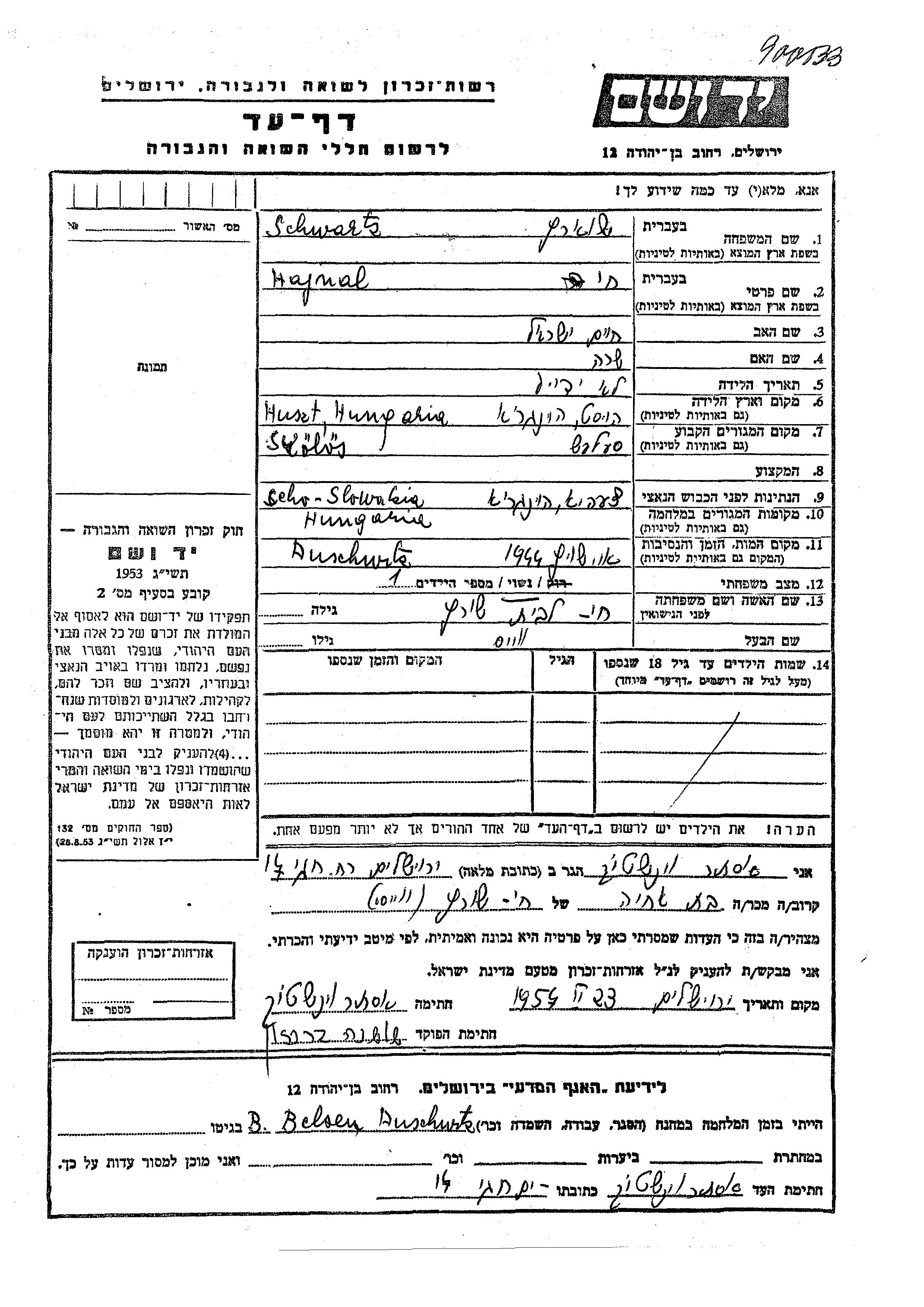 Schwartz Vais Hajnal Khai Szollos, Checoslovaquia Hoja de Testimonio