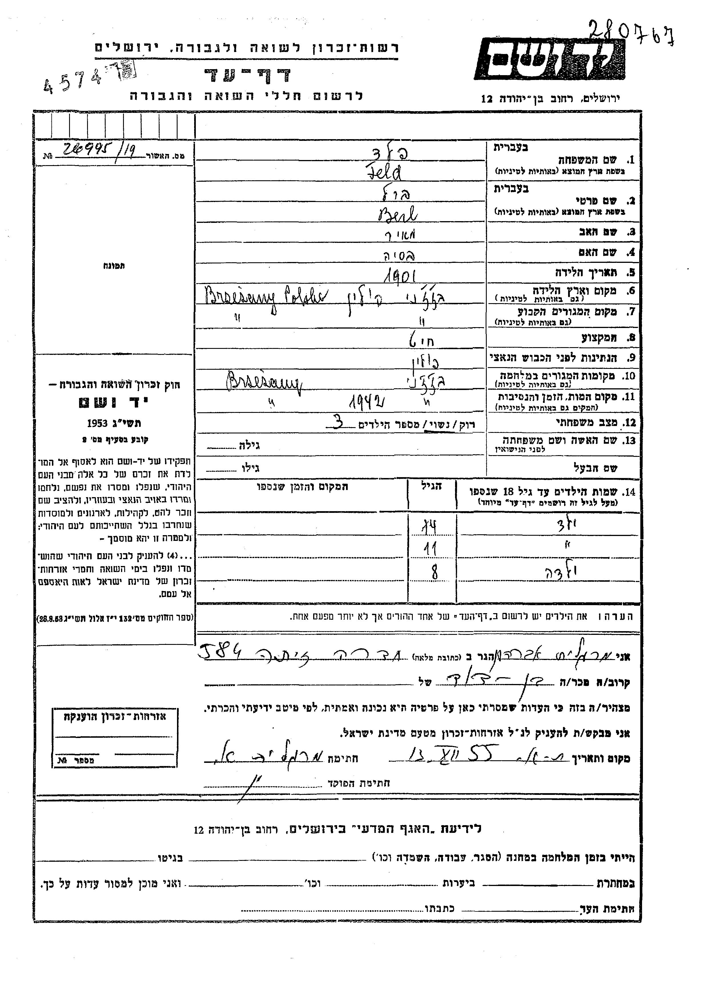 Berl Feld nació en Brzeżany, Polonia en 1901, hijo de Meir y Basia. Era Sastre y Casado. Antes de la segunda guerra mundial vivía en Brzeżany, Polonia. Durante la guerra estuvo en Brzeżany, Polonia.