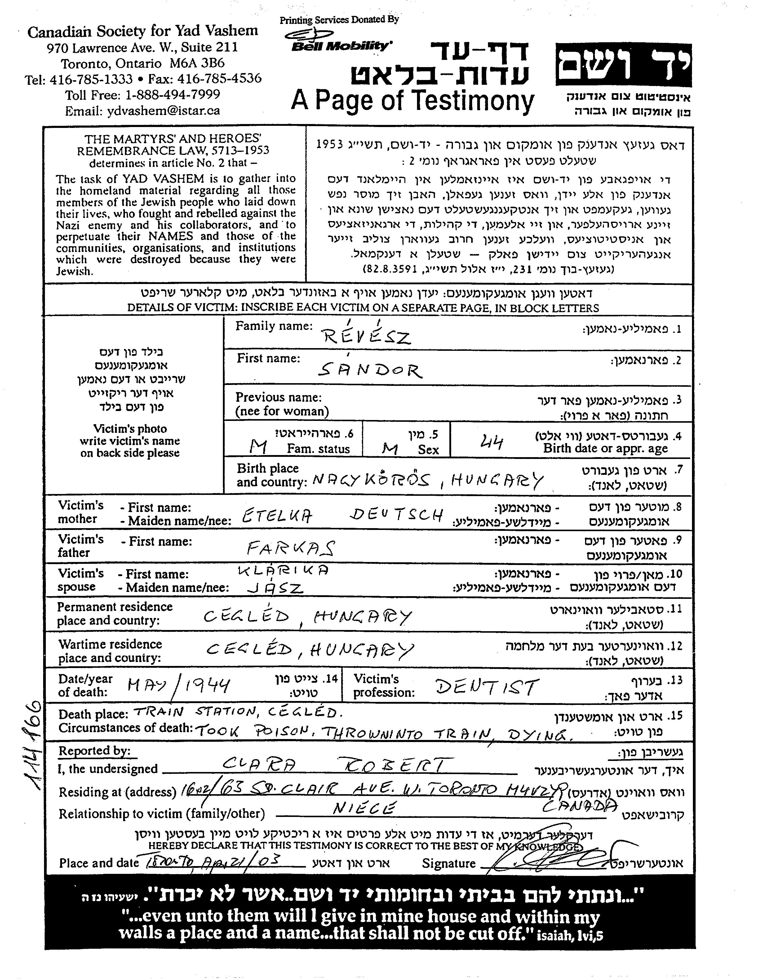 Sandor Revesz nació en Nagykoros, Hungría en 1900, hijo de Farkas y Etelka apellido de soltera Deutsch. Era Dentista y Casado con Klarika apellido de soltera Jasz. Antes de la segunda guerra mundial vivía en Cegled, Hungría. Durante la guerra estuvo en Cegled, Hungría.