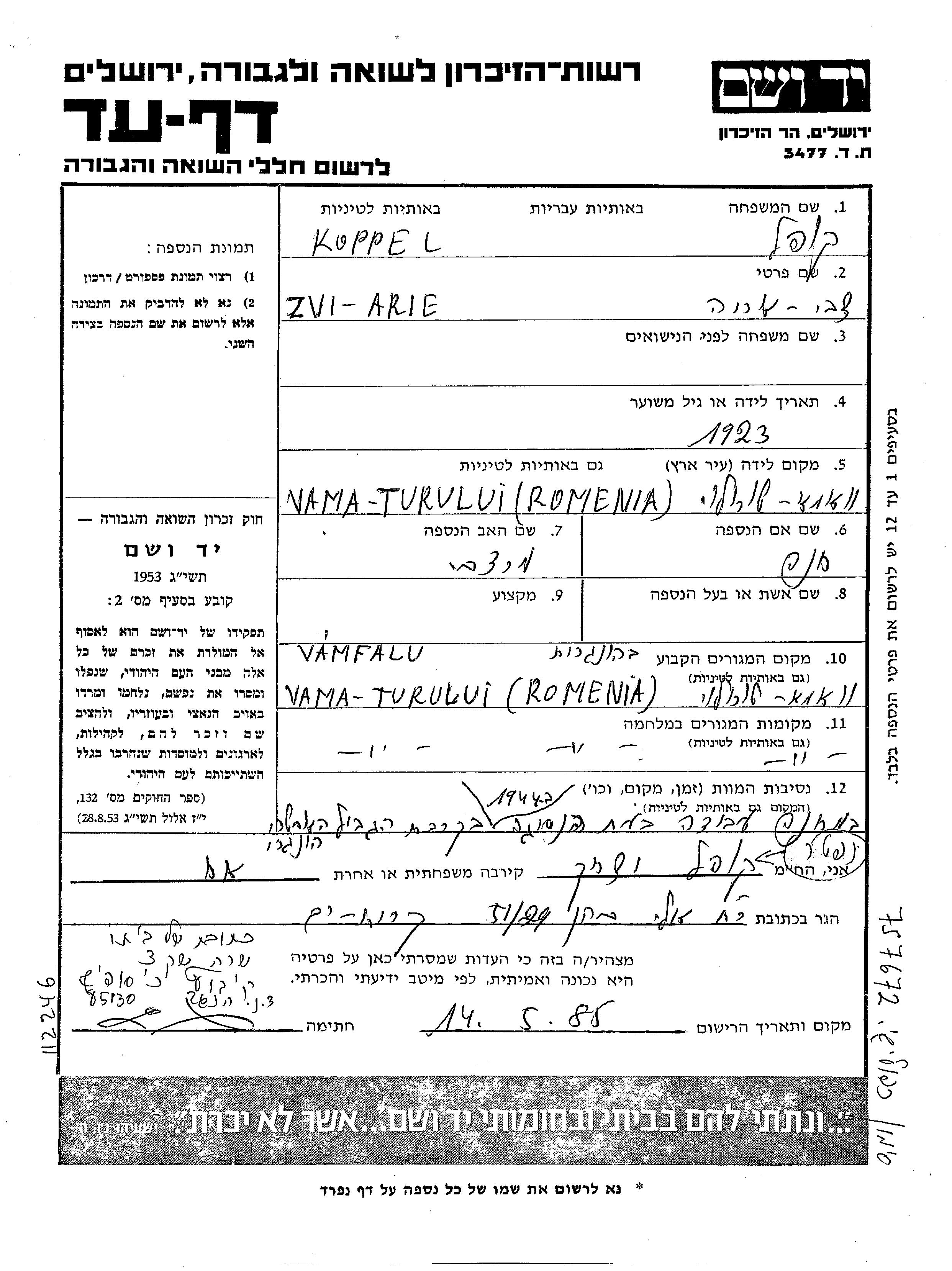 Koppel Arie Tzvi 1923 Vamfalu, Rumania Hoja de Testimonio