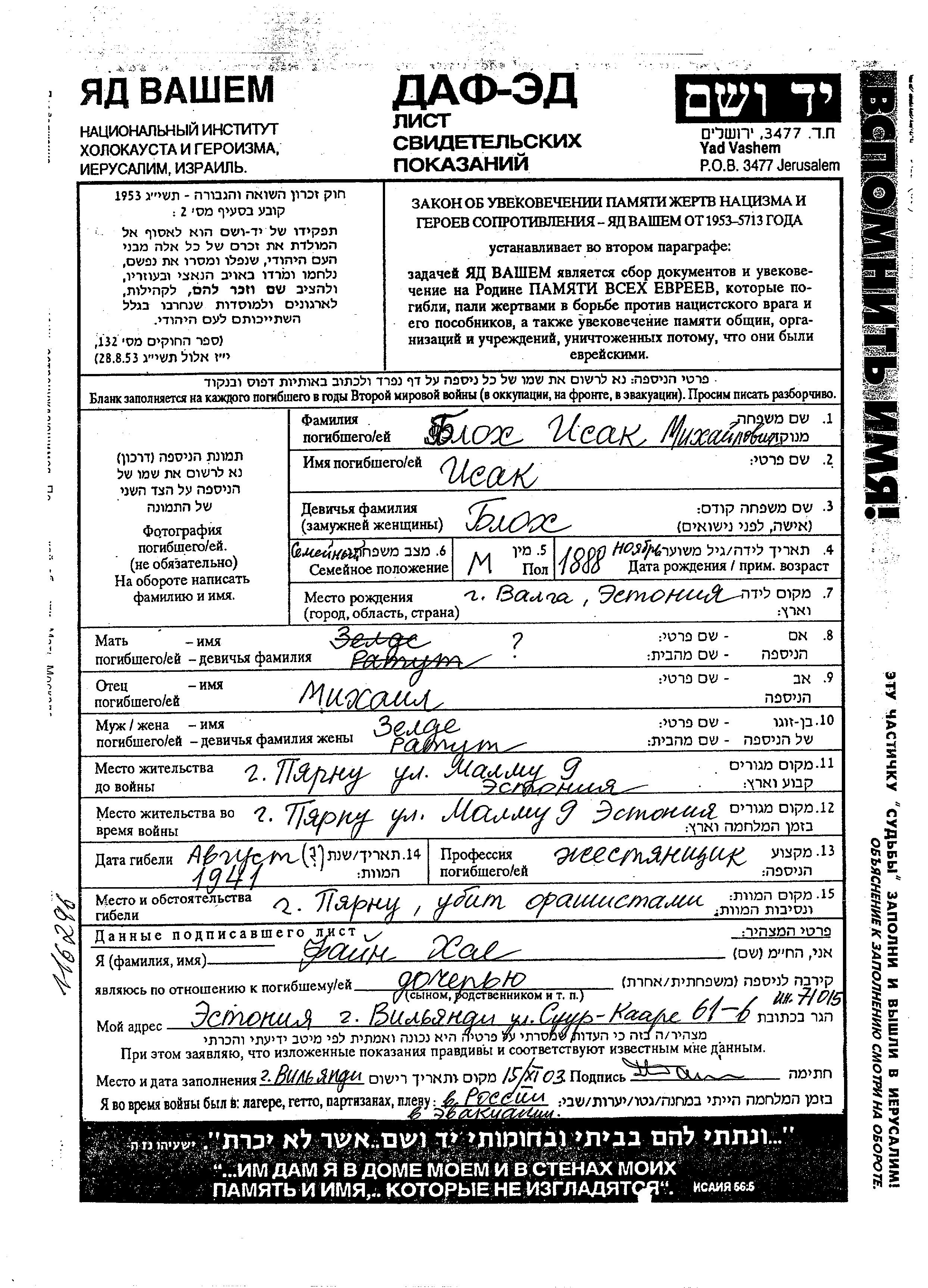 Blokh Isak 1888 Parnu, Estonia Hoja de Testimonio