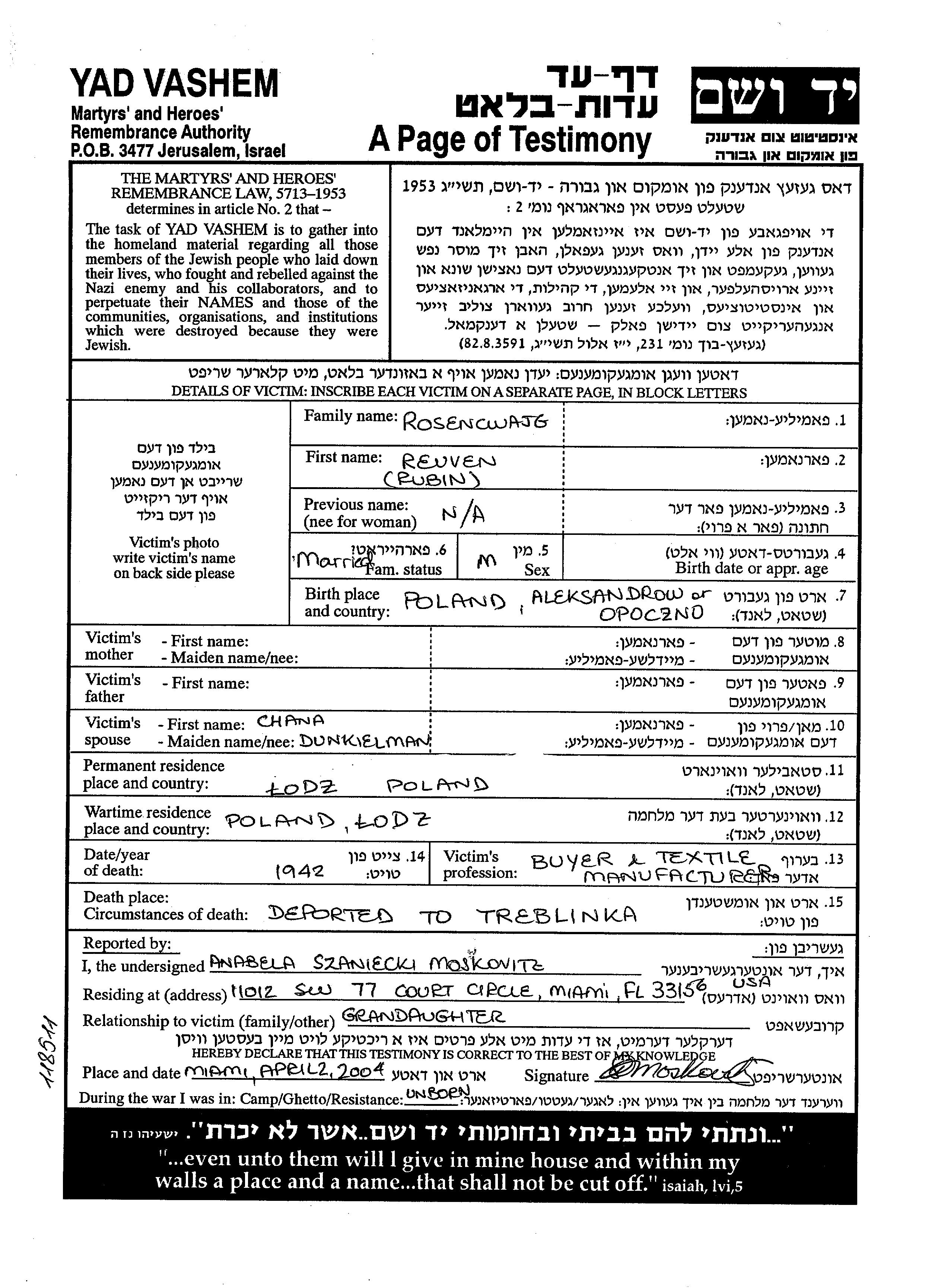 Rosencwajg Rubin Lodz, Polonia Hoja de Testimonio