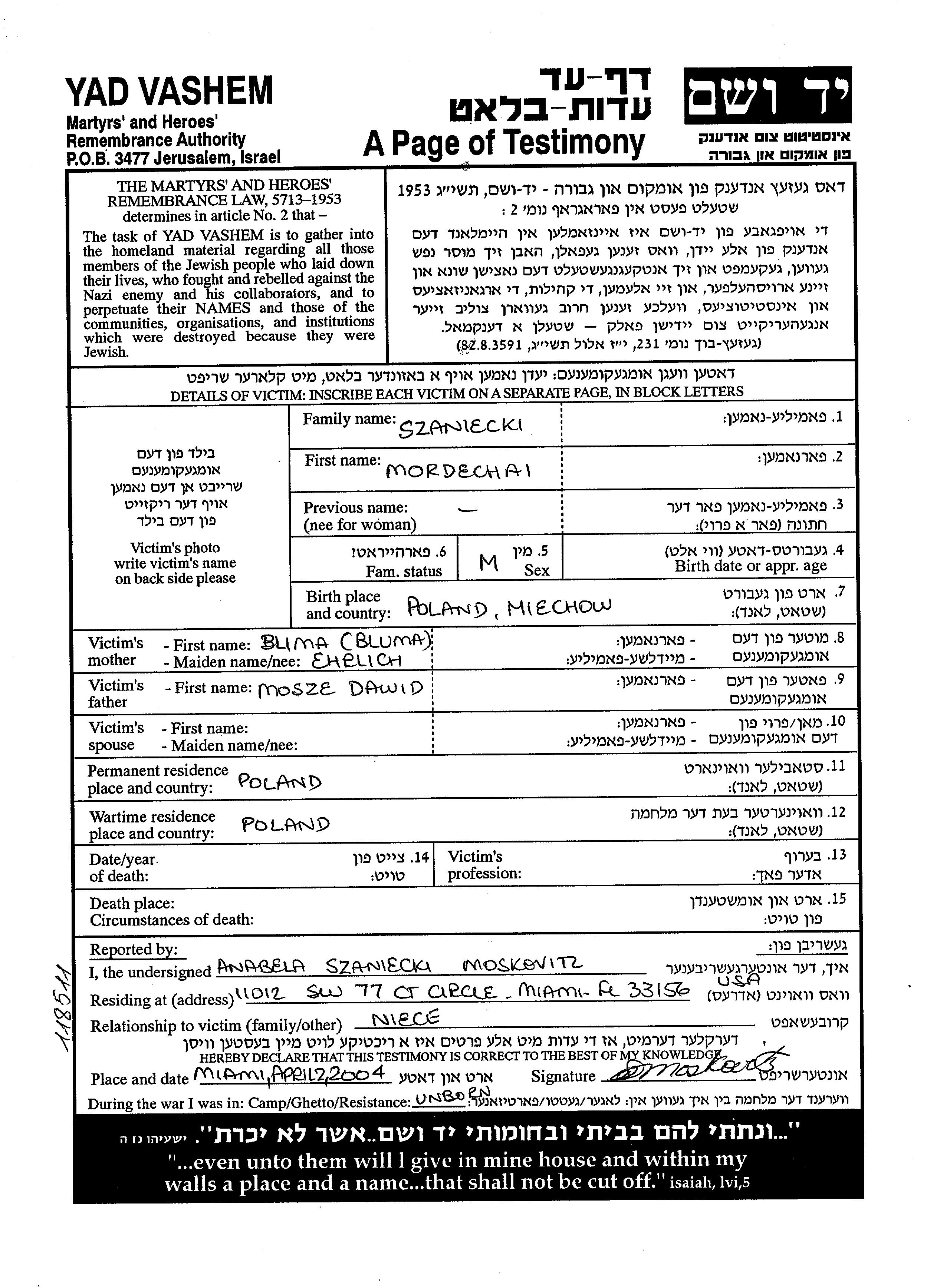 Szaniecki Mordechai Polonia Hoja de Testimonio
