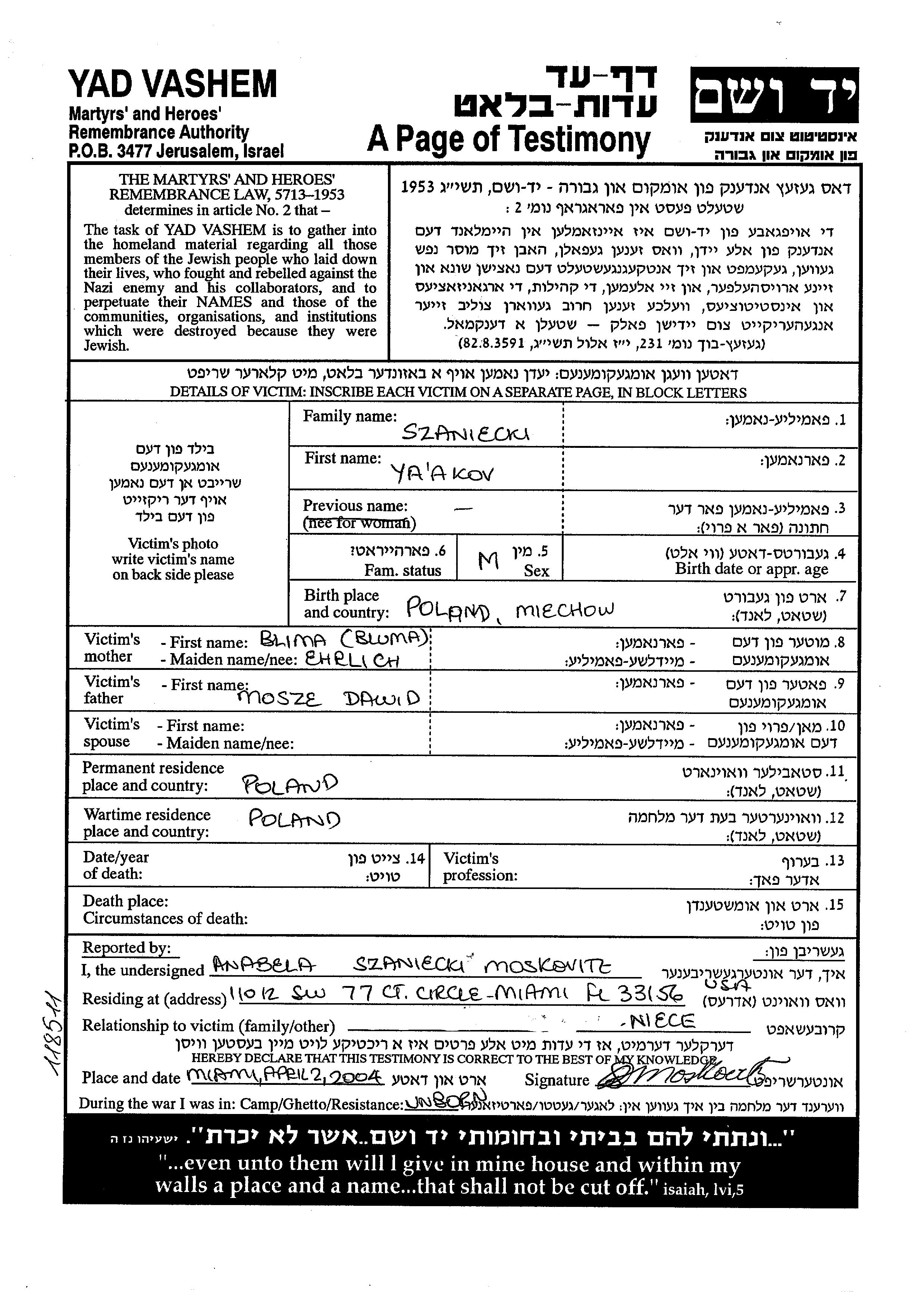 Szaniecki Yaakov Polonia Hoja de Testimonio