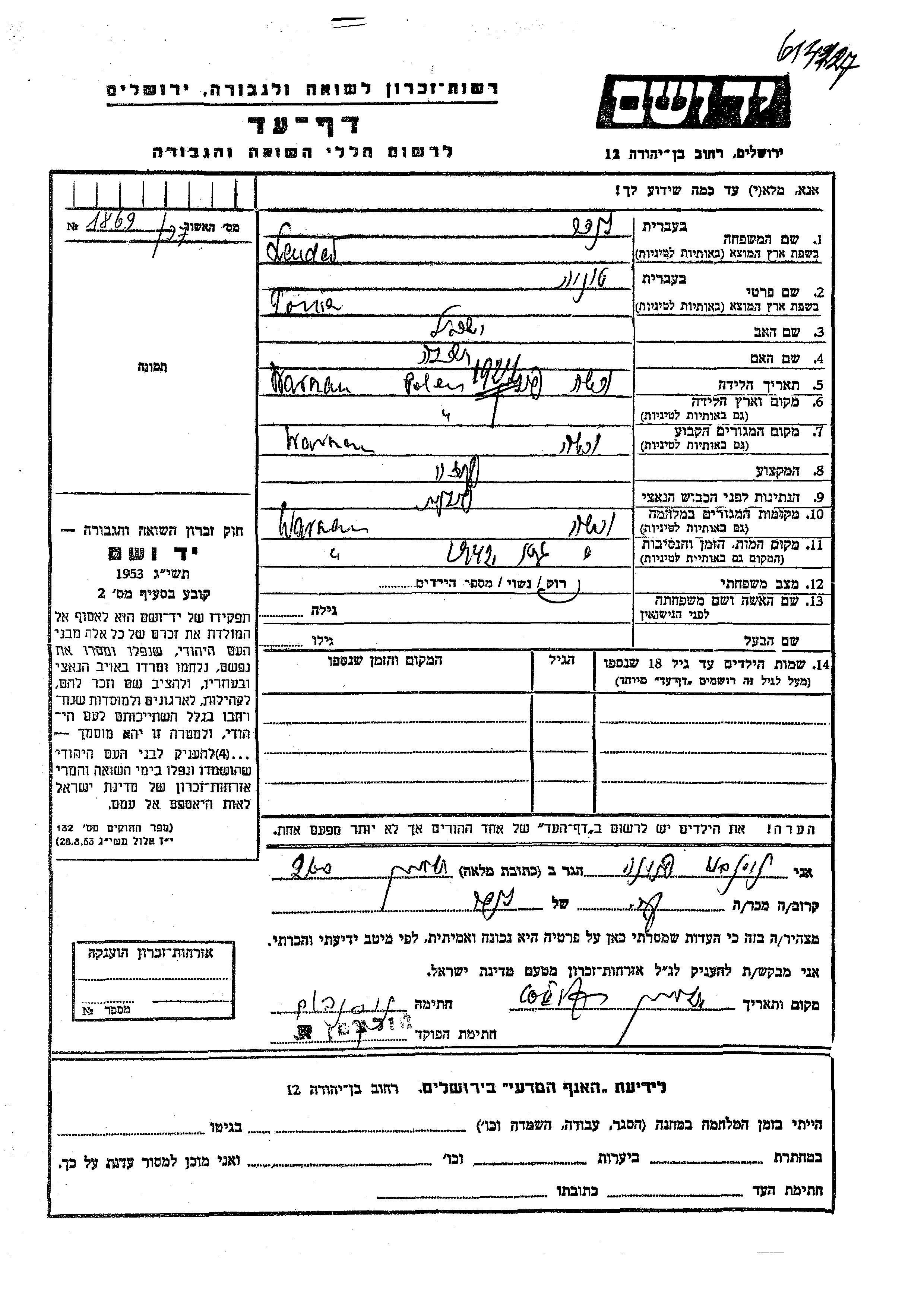 Yad Vashem - Colección conmemorativa de Hojas de Testimonio