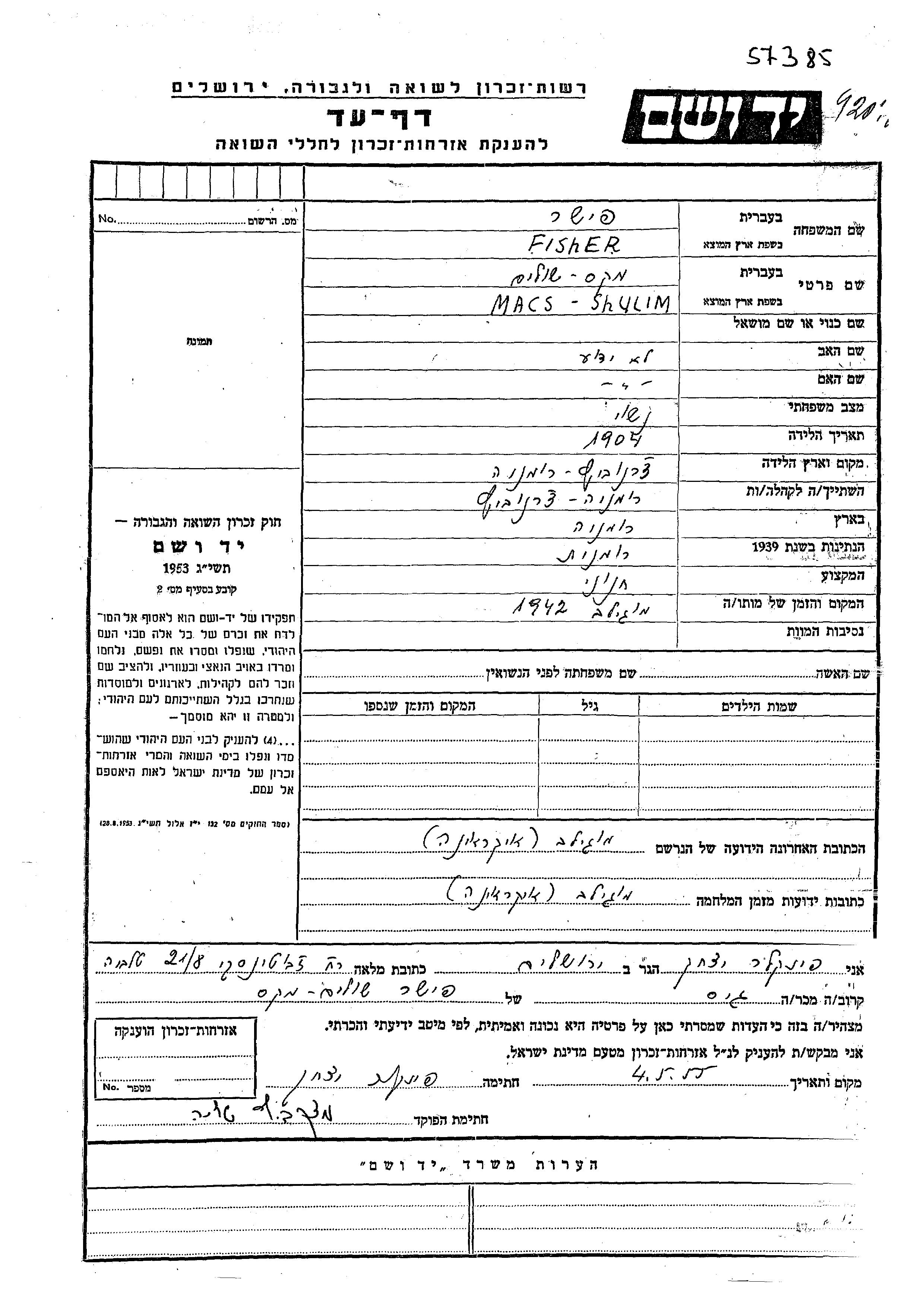 Fisher Macs Shalom 1904 Chernowitz, Rumania Hoja de Testimonio