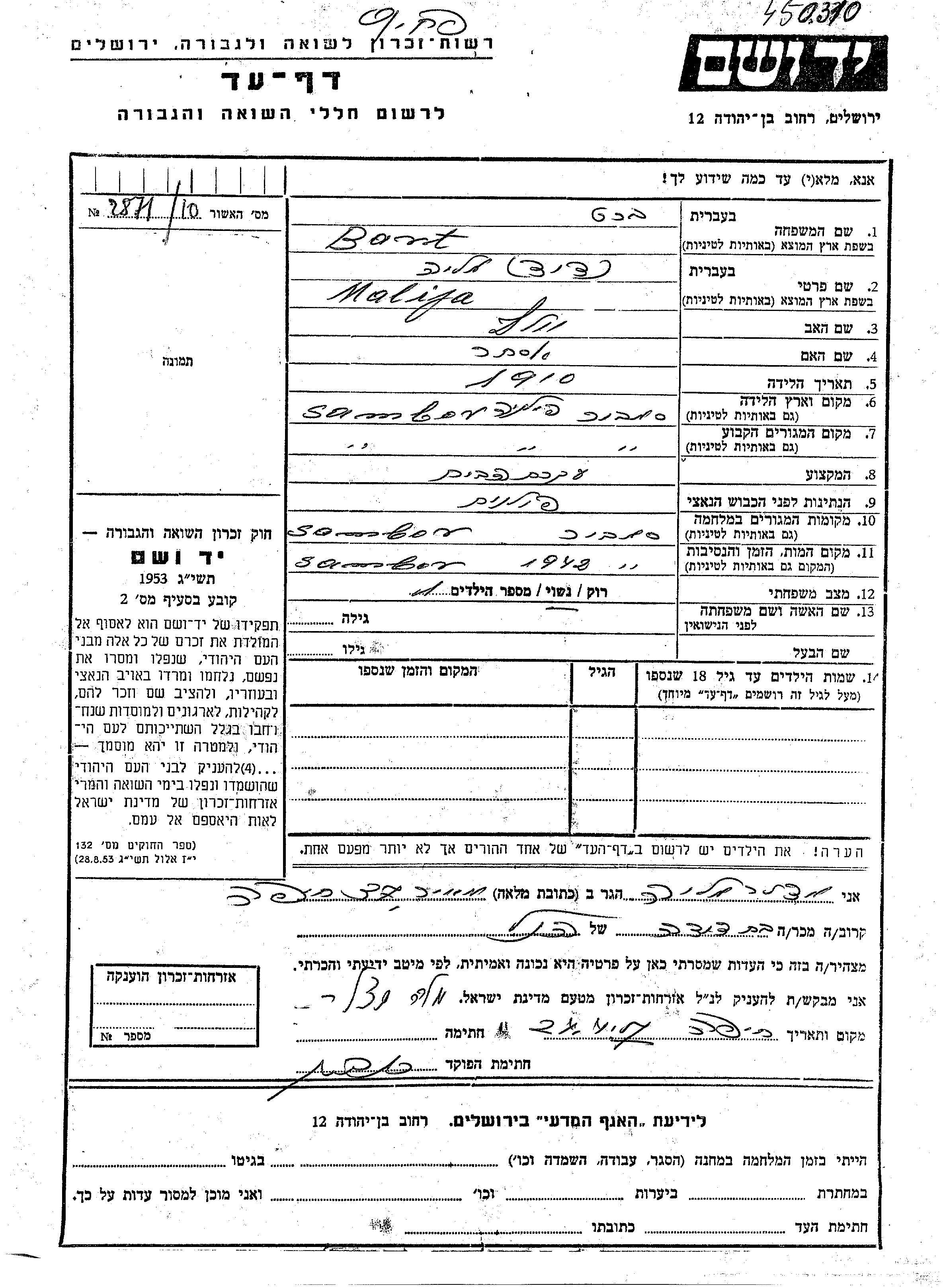 Bart Malija Malia 1910 Sambor, Polonia Hoja de Testimonio
