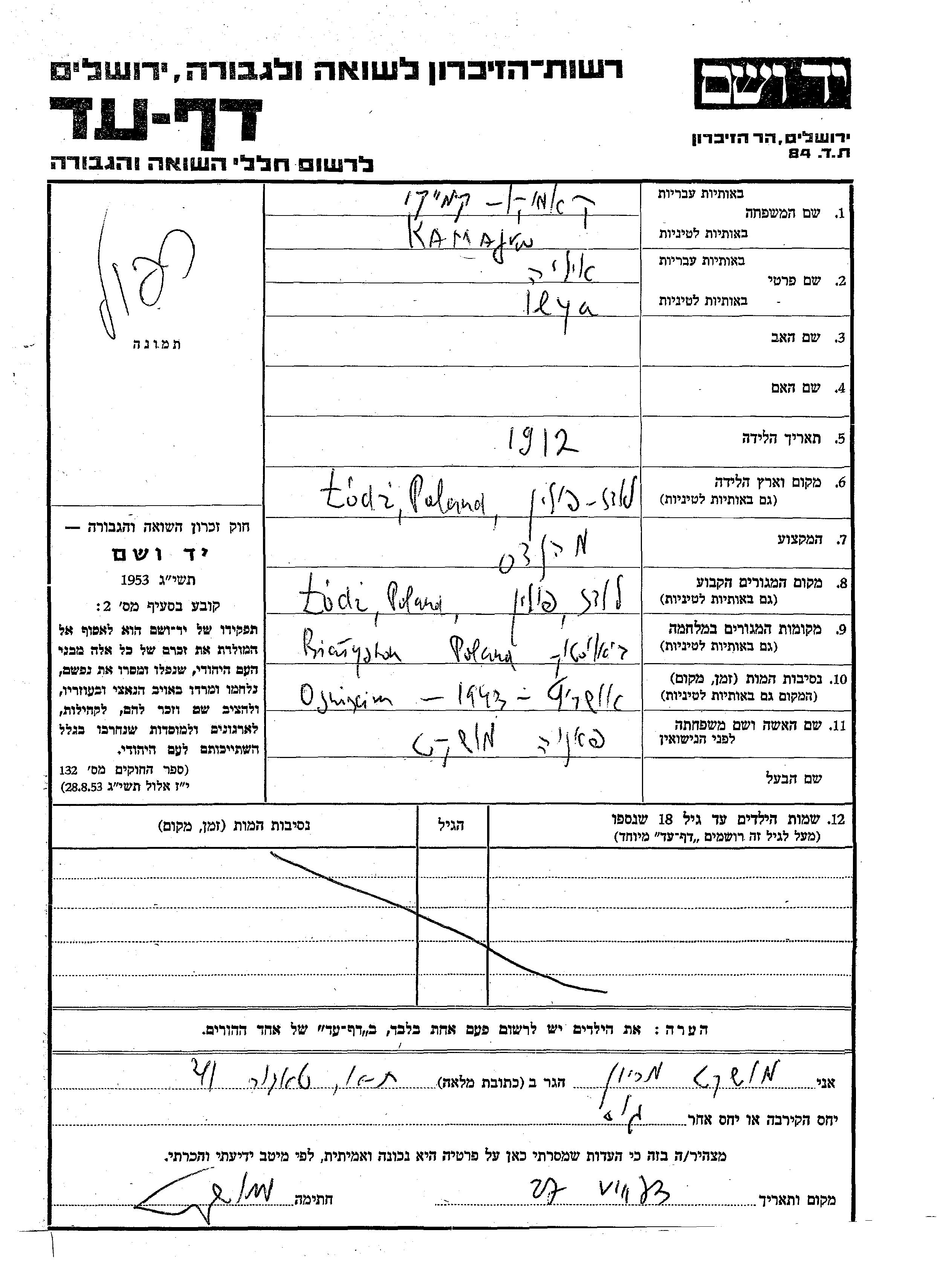 Kamajko Ilya 1912 Lodz, Polonia Hoja de Testimonio
