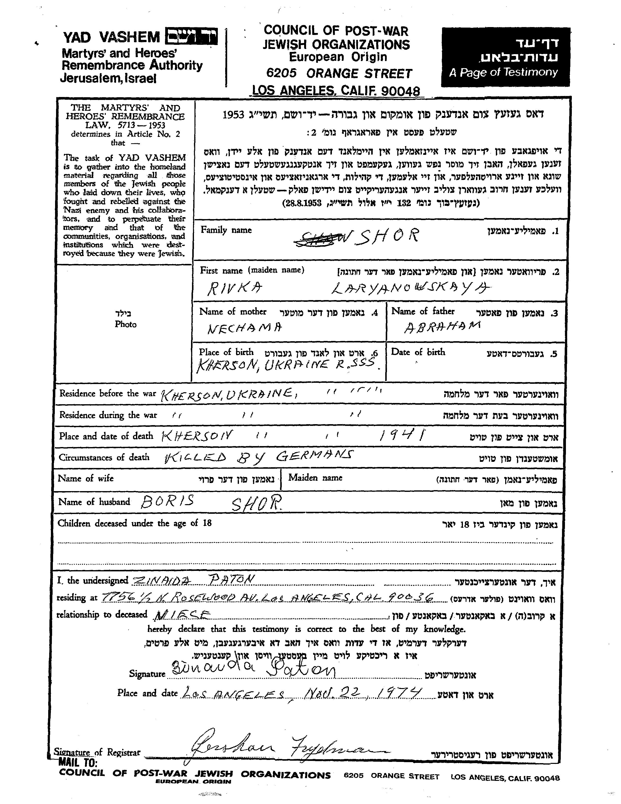 Shor Rivka Kherson, Ucrania (URSS) Hoja de Testimonio