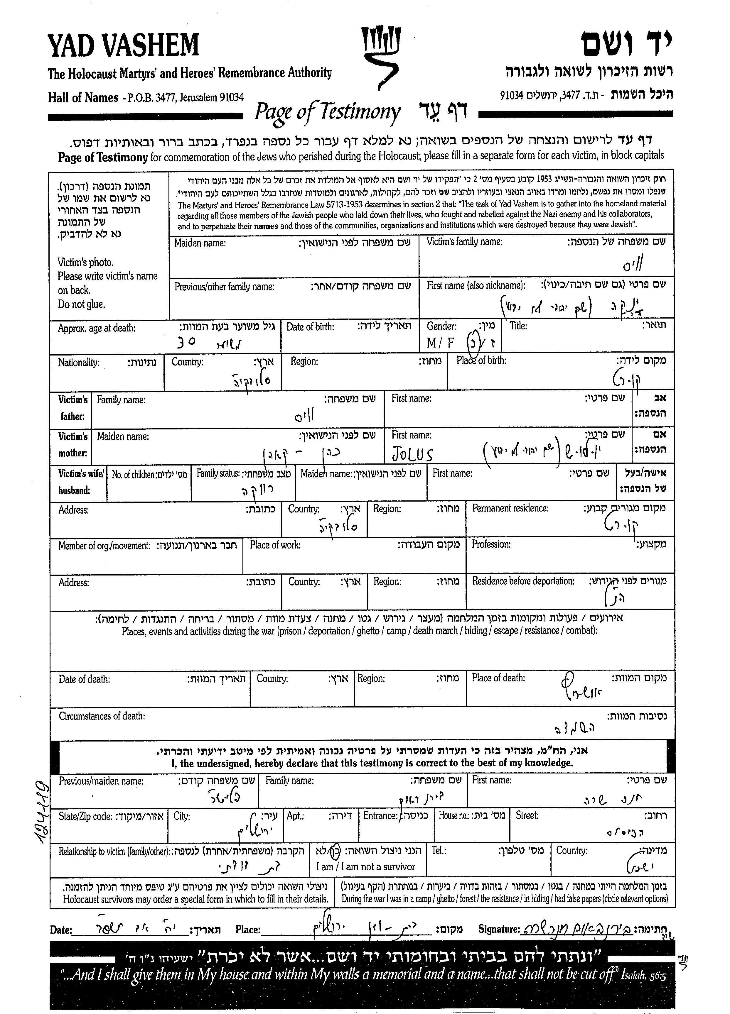 Vais Ianka Kurt, Checoslovaquia Hoja de Testimonio
