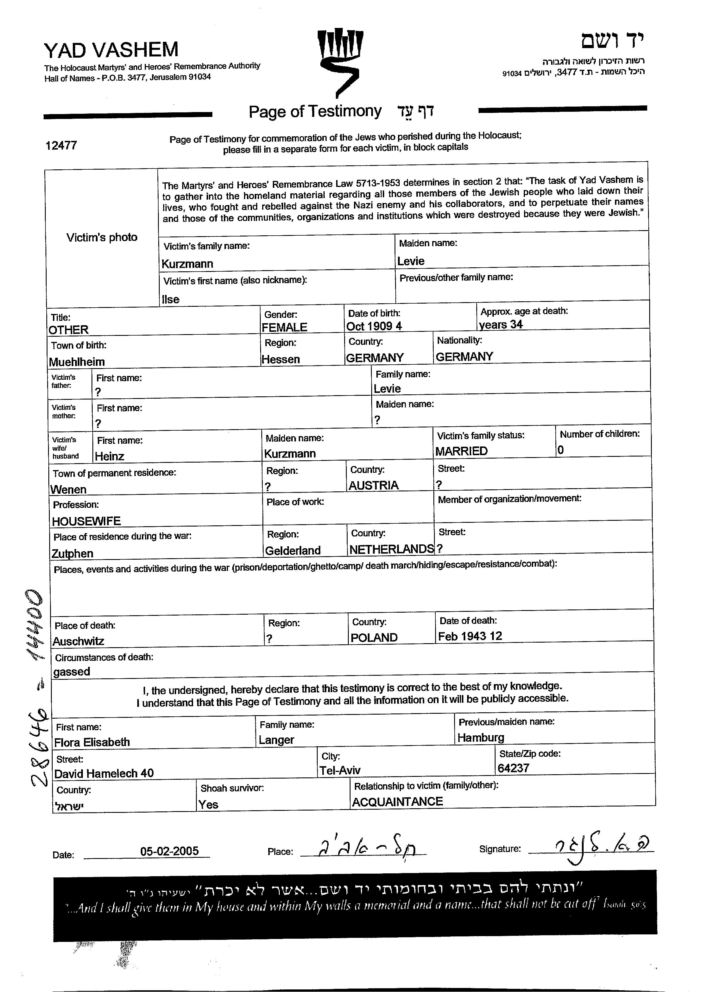 Ilse Kurzmann apellido de soltera Levie nació en Muehlheim, Alemania en 1909. Era casada con Heinz apellido de soltera Kurzmann. Antes de la segunda guerra mundial vivía en Wien, Austria. Durante la guerra estuvo en Wien, Austria. Ilse fue asesinada durante la Shoá. Lugar de la muerte: Auschwitz, Polonia en 12/02/1943.