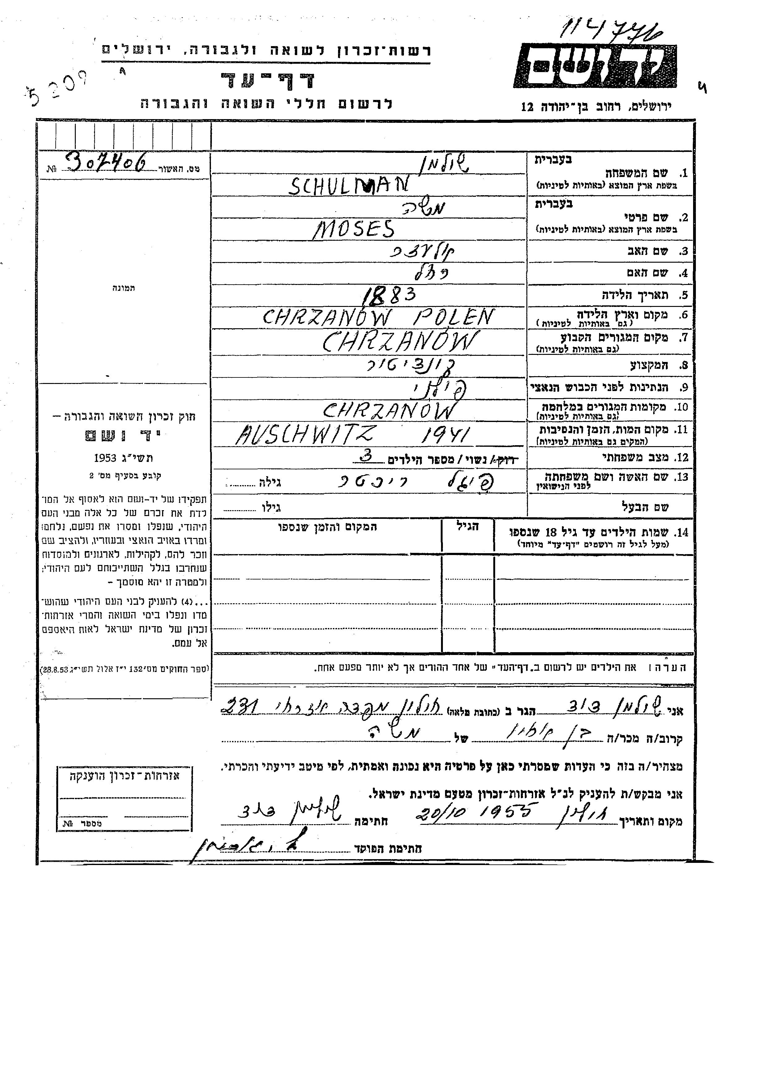 Moses Schulman nació en Chrzanow, Polonia en 1883, hijo de Elazar y Rakhel. Era Pastelero y Casado con Feigl apellido de soltera Rikhter. Antes de la segunda guerra mundial vivía en Chrzanow, Polonia. Durante la guerra estuvo en Chrzanow, Polonia.