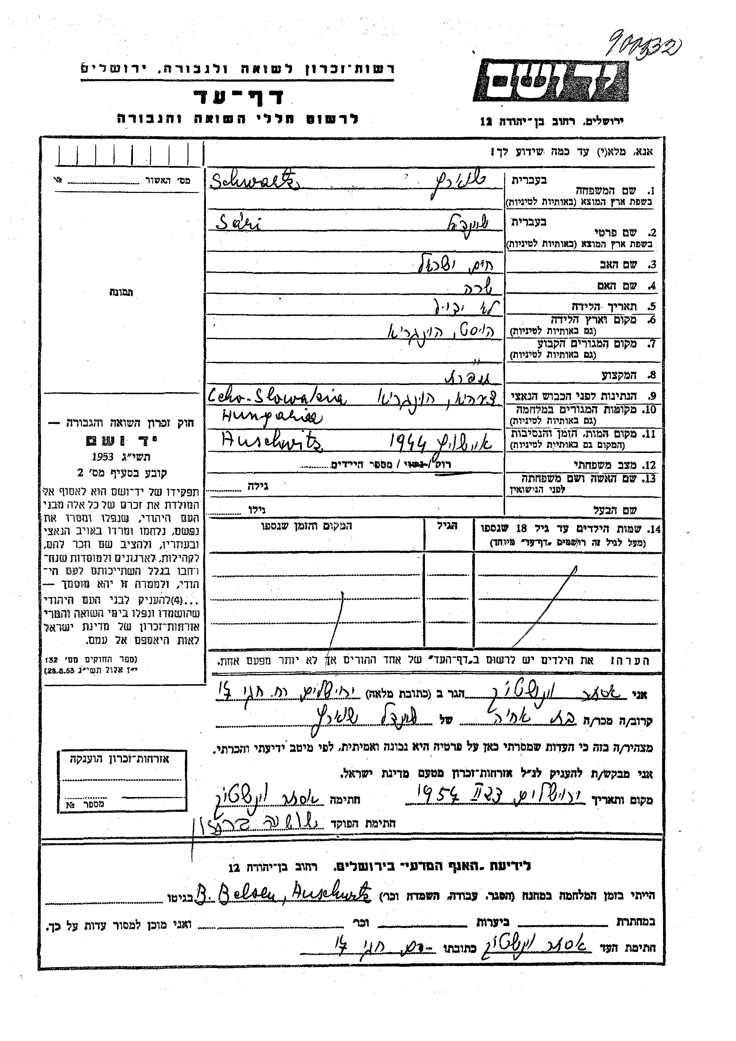 Schwartz Sani Sheindl Hust, Checoslovaquia Hoja de Testimonio