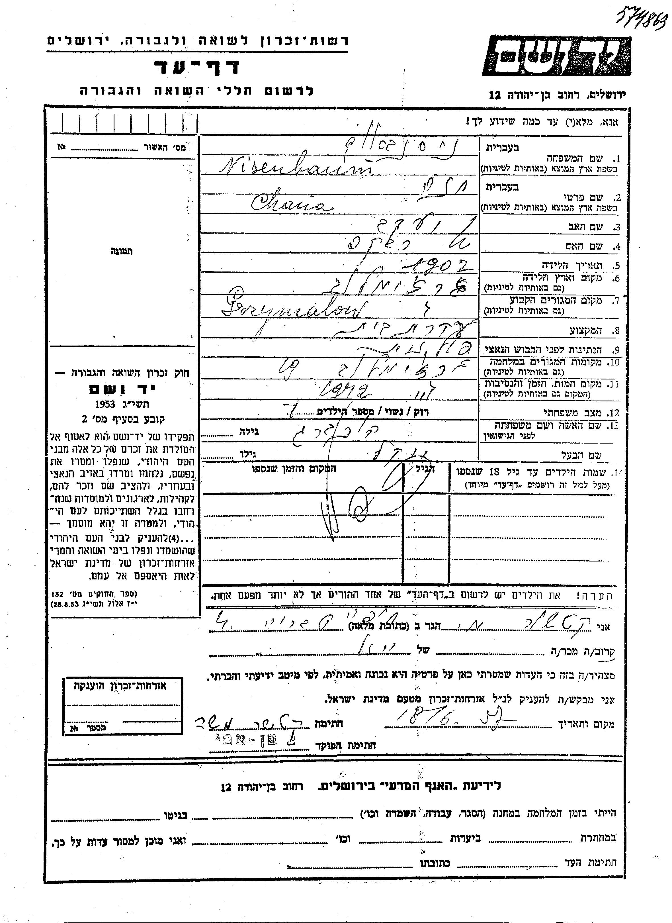 Nisenbaum Chana 1902 Grymalov, Polonia Hoja de Testimonio