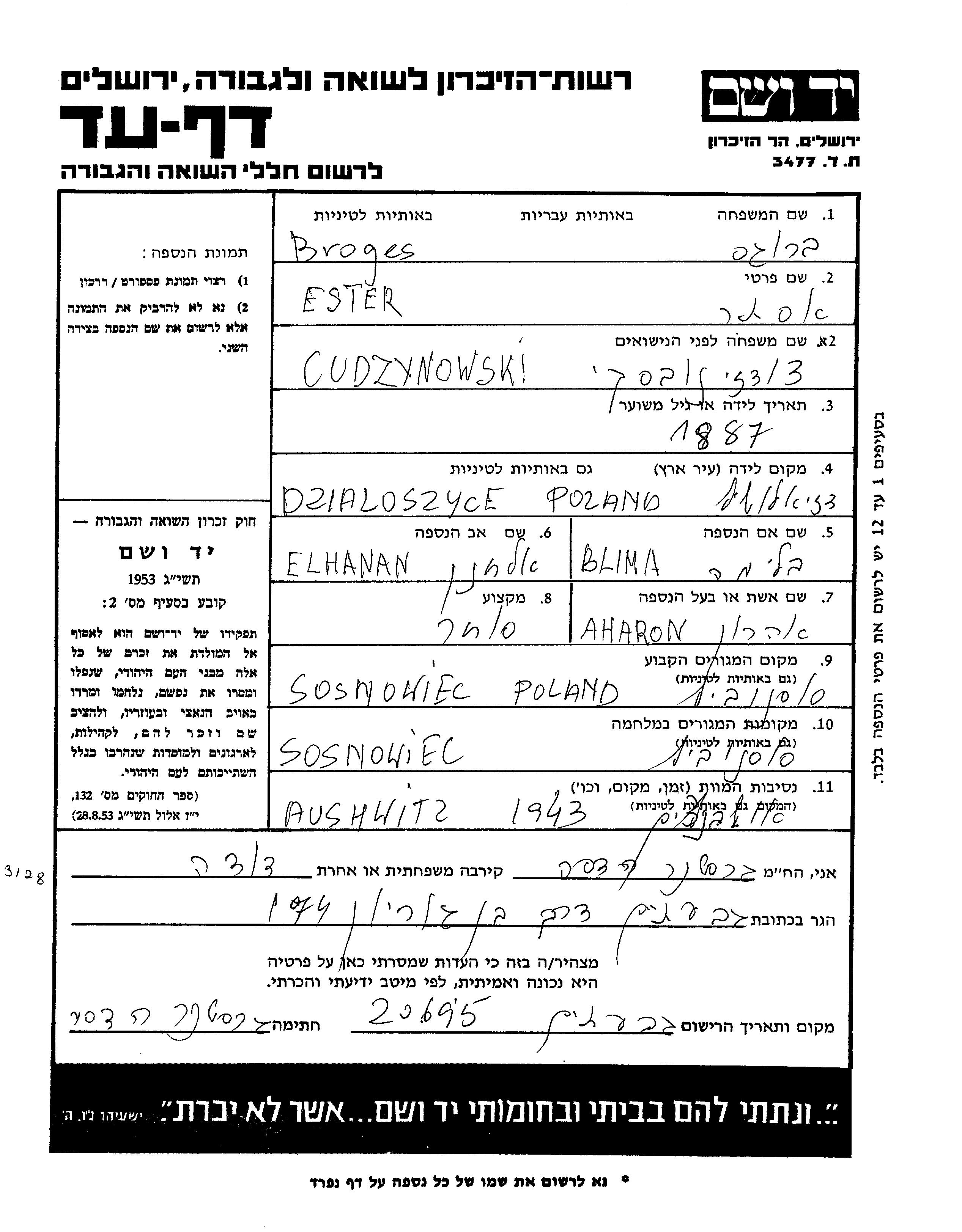 Ester Broges apellido de soltera Tzudzinovski nació en Dzialoszyce, Polonia en 1887, hija de Elhanan y Blima. Era Comereciante y casada con Aharon. Antes de la segunda guerra mundial vivía en Sosnowiec, Polonia. Durante la guerra estuvo en Sosnowiec, Polonia.