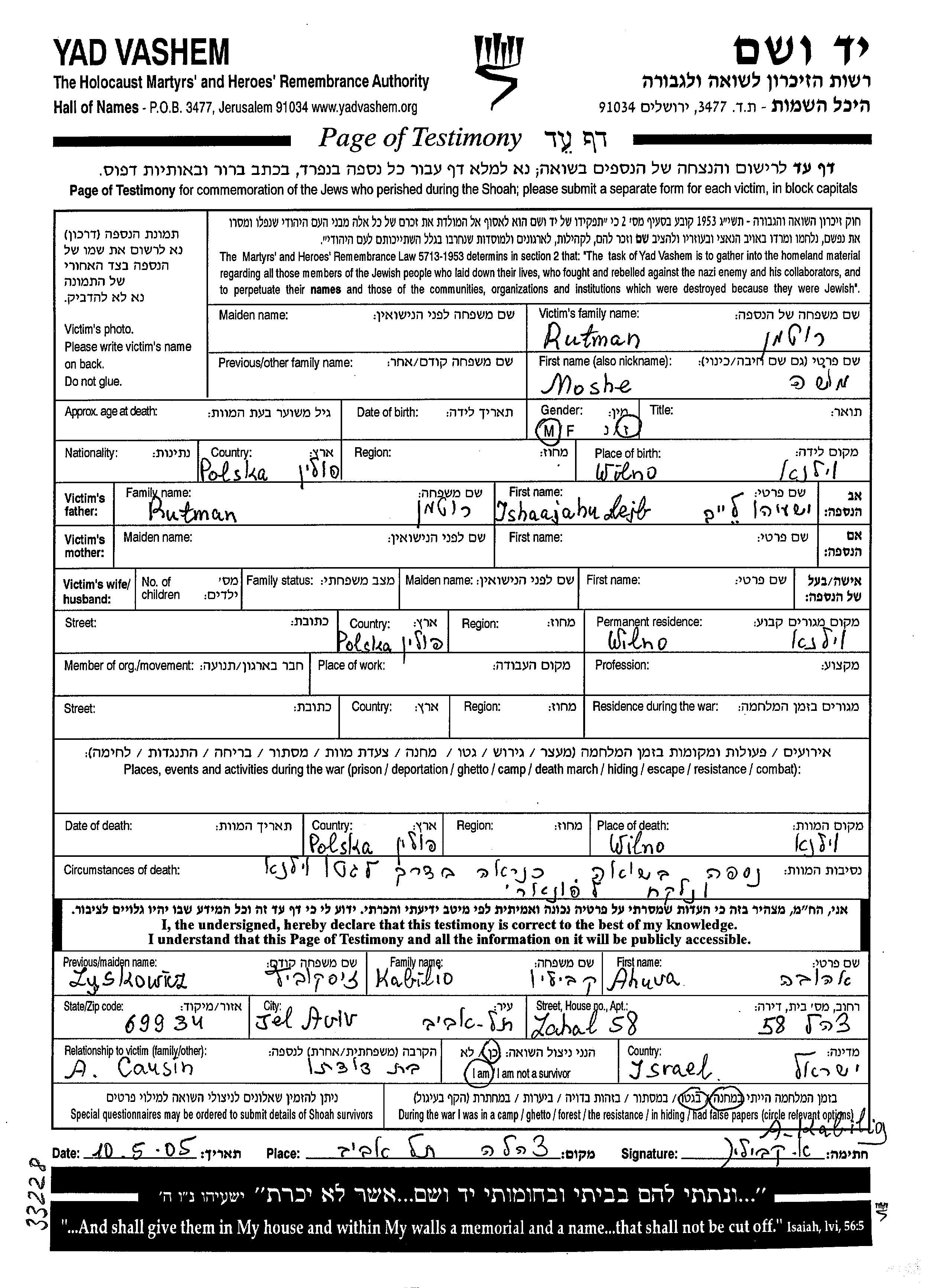 Rutman Moshe Wilno, Polonia Hoja de Testimonio